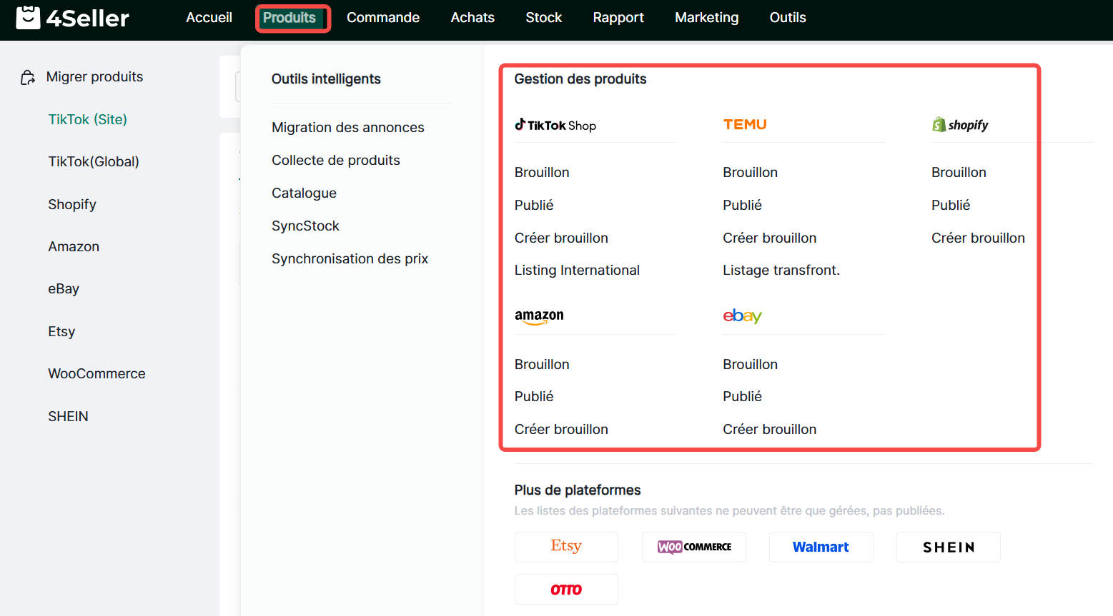 4Seller prend en charge la migration de produits depuis Shopify, Amazon, TikTok, eBay, Etsy, WooCommerce et Shein vers Temu.