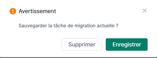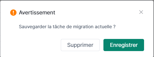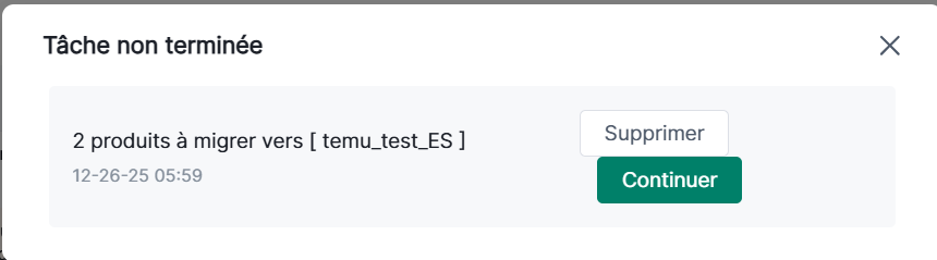 Une seule tâche de migration peut être exécutée par boutique à la fois. Si une tâche inachevée existe, une fenêtre contextuelle apparaîtra. Vous pourrez choisir de continuer la tâche existante ou en démarrer une nouvelle (les tâches non terminées seront supprimées).