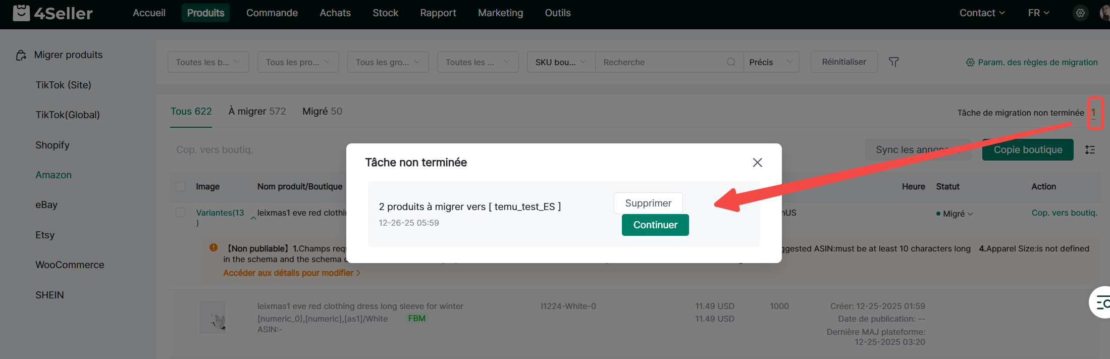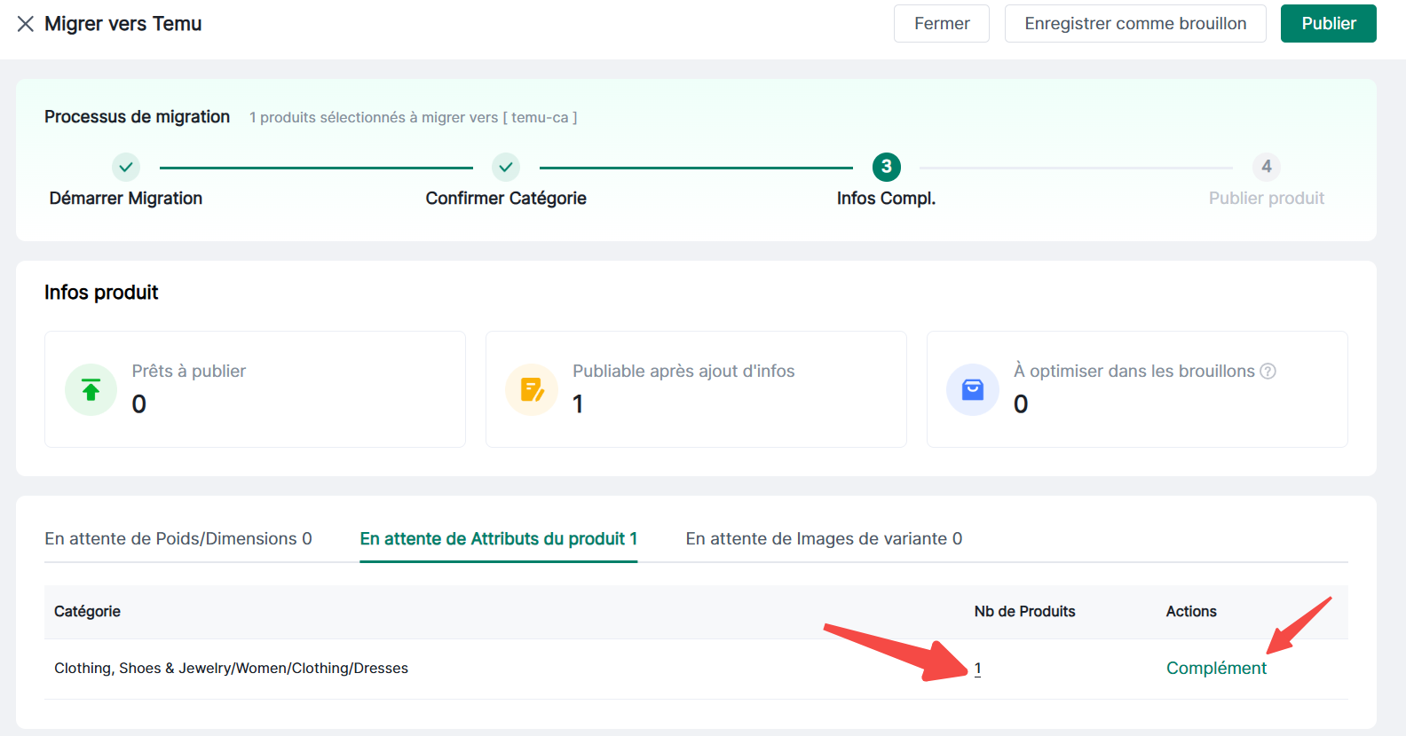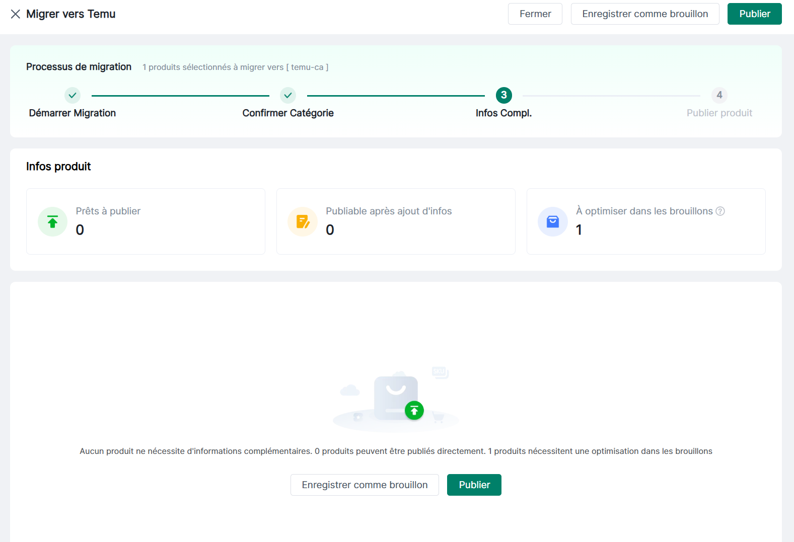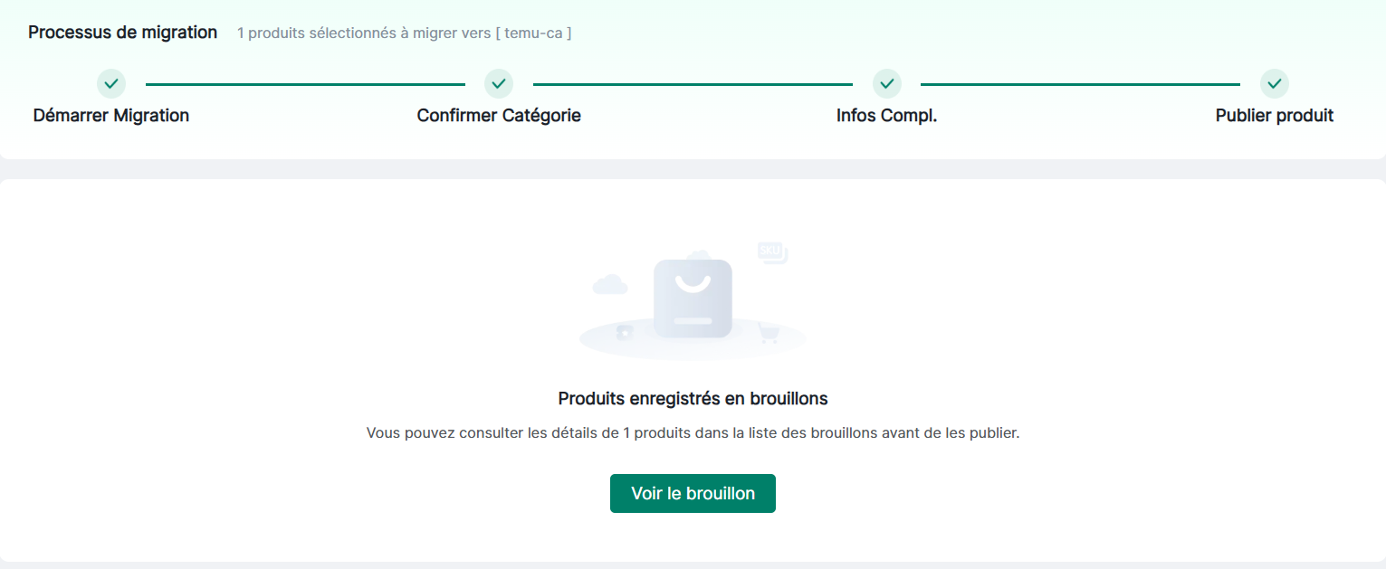 3. Enregistrer comme brouillon : cliquez sur Voir le brouillon pour accéder à la section brouillons, affichant les produits enregistrés durant cette migration.