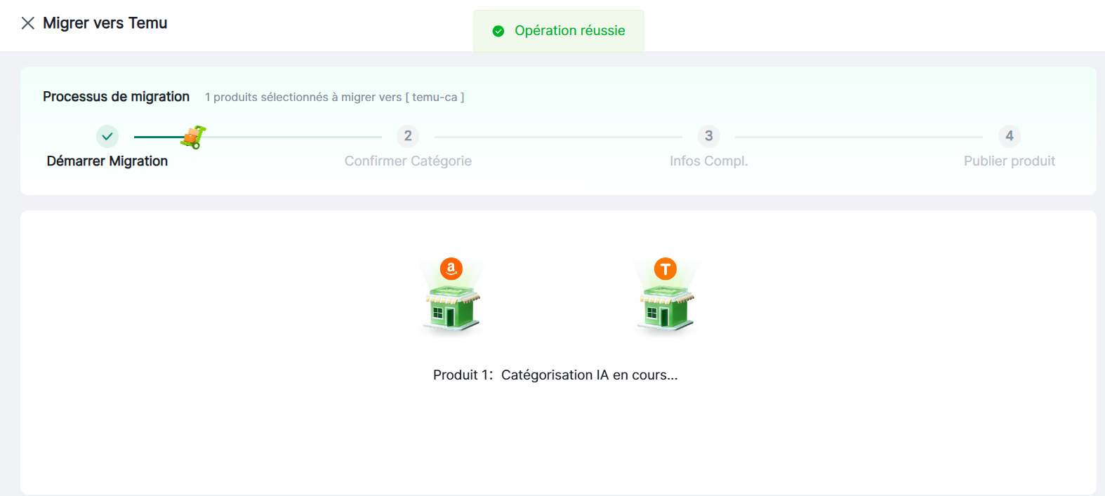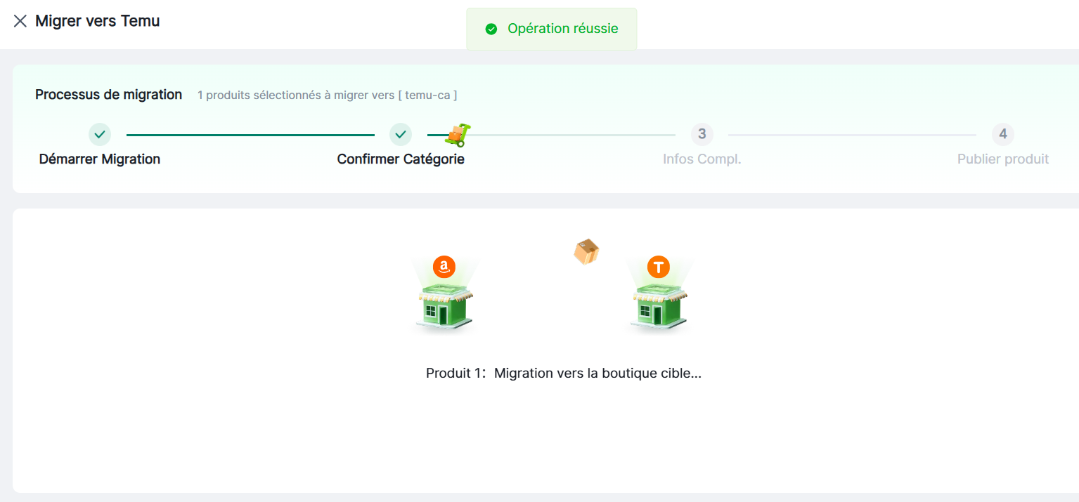 Le flux de migration se compose de 4 étapes : Démarrer la migration → Confirmer les catégories → Compléter les informations → Publier les produits.