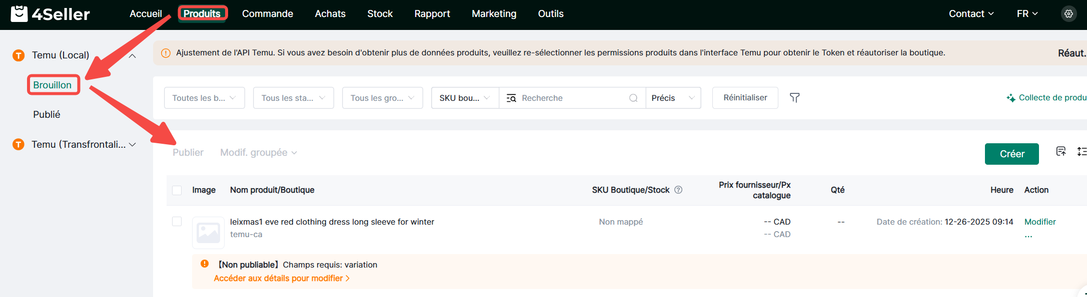 3. Optimisation du brouillon requise : ces produits ne répondent pas aux exigences de la plateforme. Veuillez les optimiser dans les brouillons et les publier plus tard.