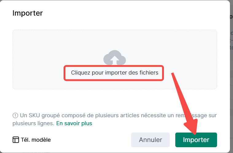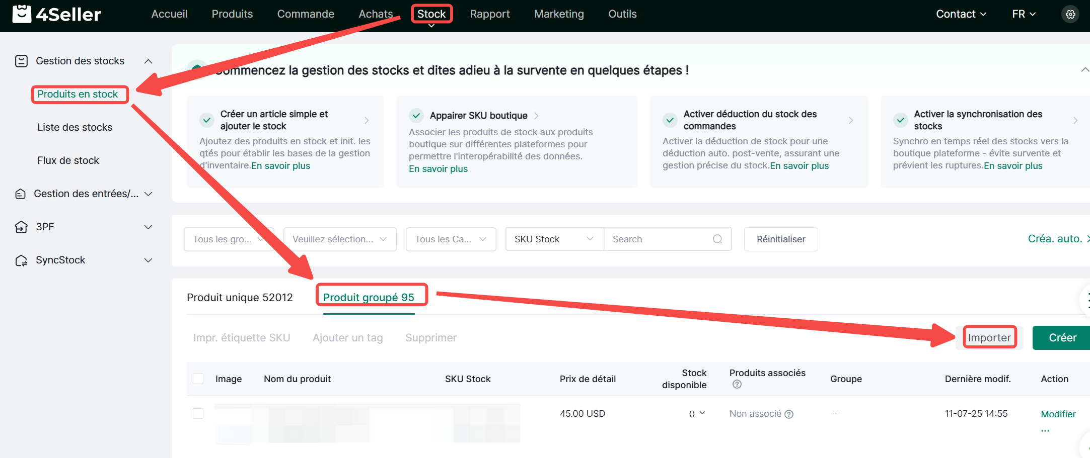 1. Cliquez sur Stock → Produit → Groupés → Importer.