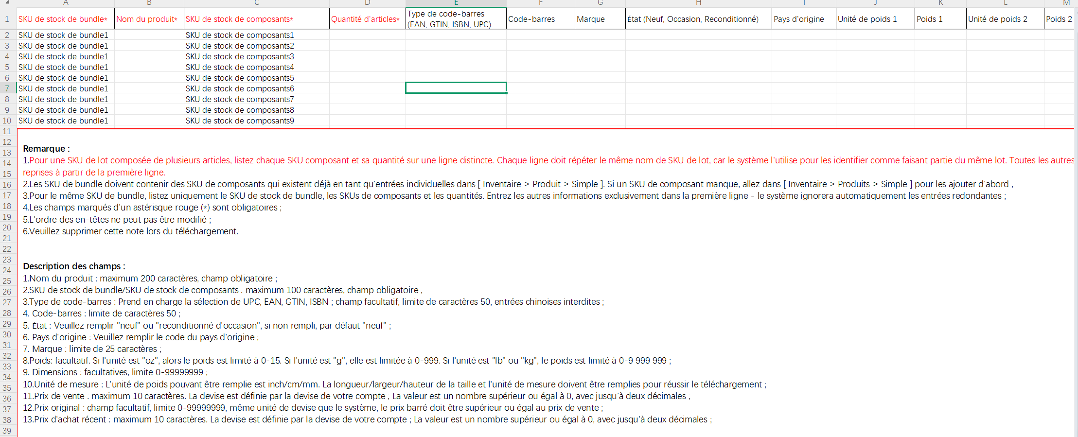 3. Les versions linguifiques utilisent des templates correspondants. Consultez les exemples avant remplissage.Un SKU groupé composé de plusieurs articles nécessite un remplissage sur plusieurs lignes .Comme le montre la figure ci-dessous