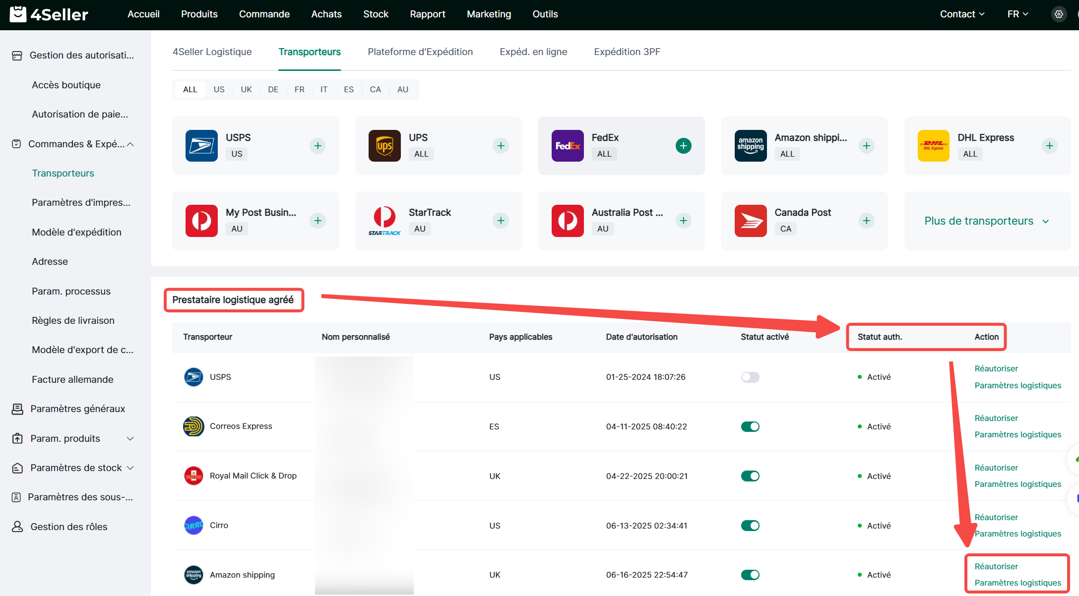 3. Après autorisation, vérifiez le statut du fournisseur de logistique et réautorisez/modifiez les canaux de livraison.