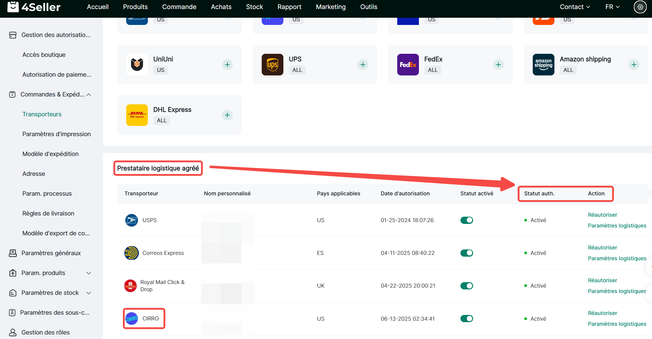 1、Cliquez sur Paramètres - Commande et transport - Prestataire logistique - Prestataire direct - Trouvez l'icône Cirro - Cliquez sur le signe « + ».