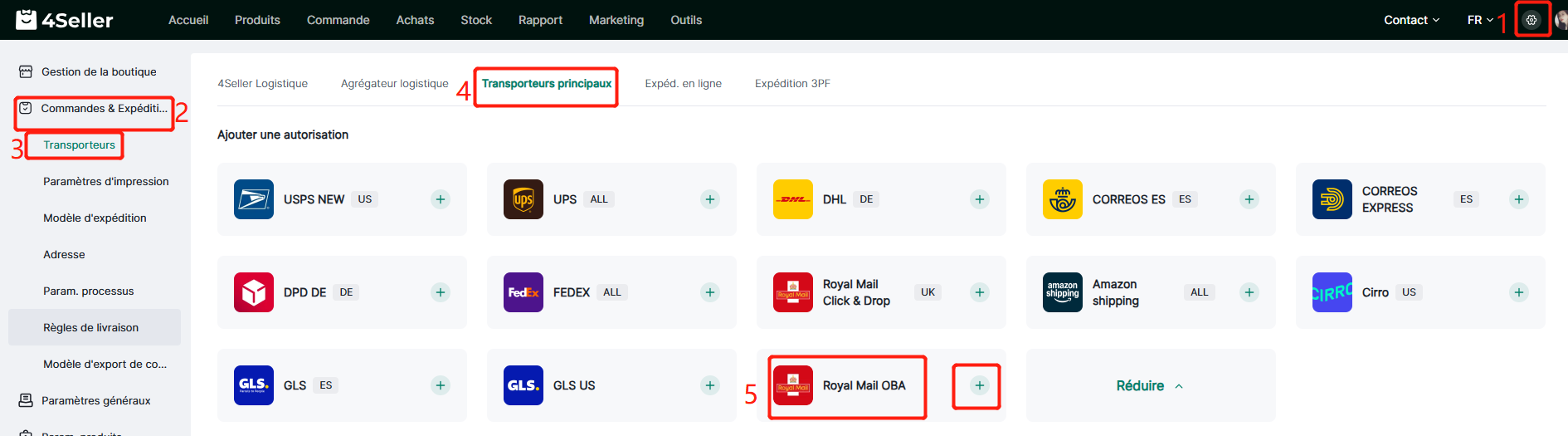 Étape 1 : Paramètres → Commandes & Livraison → Transporteurs→Transporteurs Principaux → Royal Mail OBA