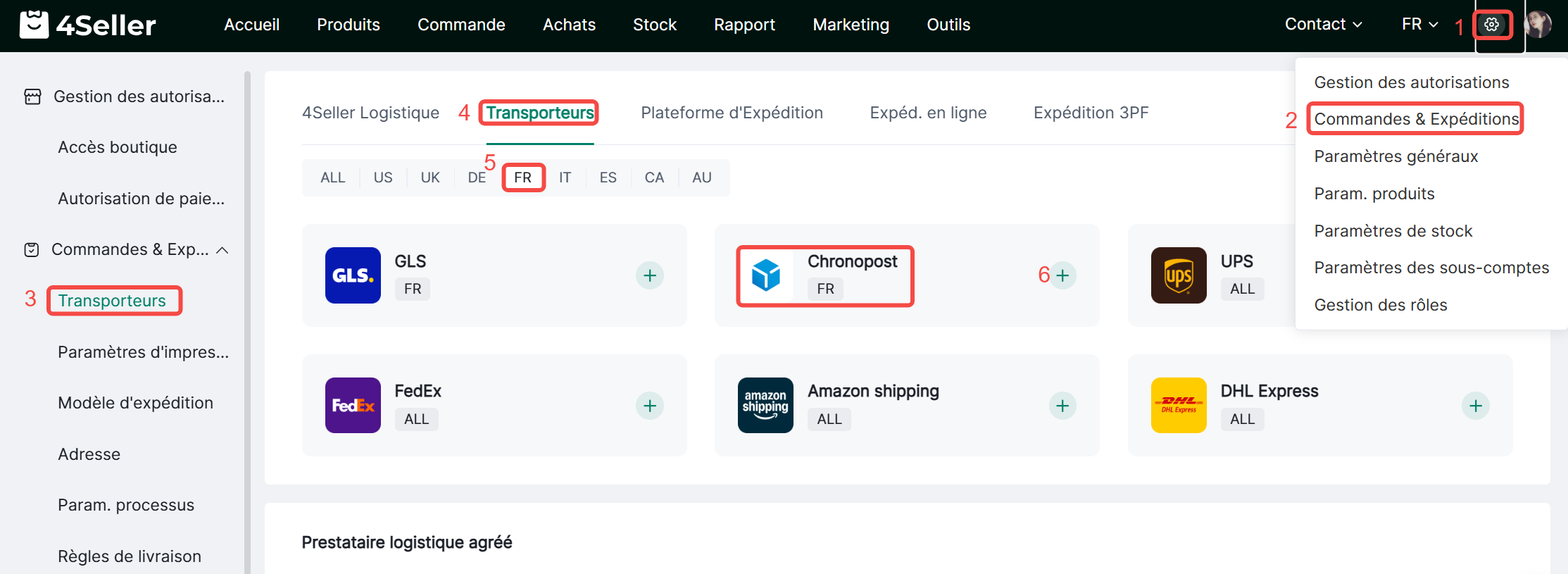 1、Cliquez sur Paramètres-Commandes & Expéditions-Transporteurs-Transporteurs principaux-Repérez l'icône correspondante -Cliquez sur ‘+’.
