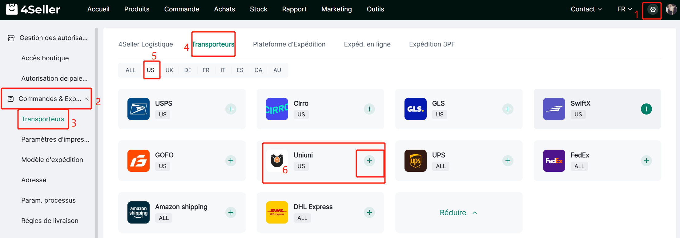 Étape 1 : Paramètres -- Commande et expédition -- Transporteurs -- US -- UniUni