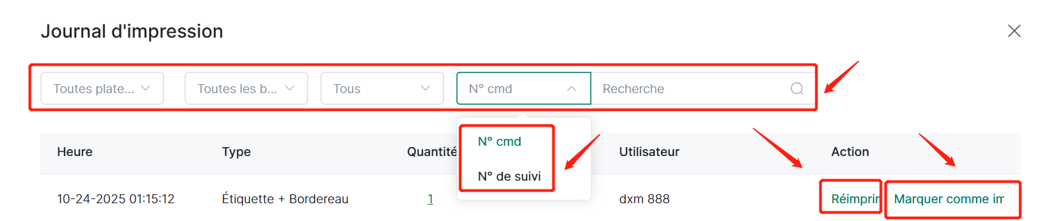 L'historique d'impression permet de filtrer selon les critères suivants, et prend en charge la réimpression ainsi que le marquage comme imprimé.