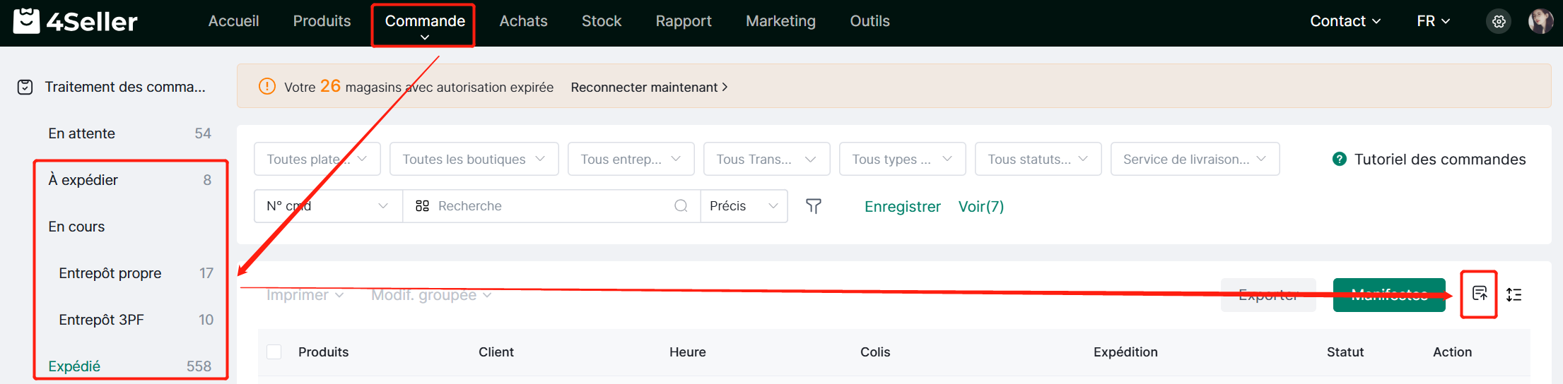 L'historique d'impression a été ajouté dans le coin supérieur droit des états À expédier, En cours et Expédié, vous permettant de visualiser chaque opération d'impression (étiquettes, bordereaux de colis et listes de prélèvement).
