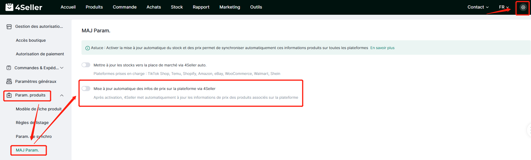 Étape 1 : Paramètres → Param. produits → MAJ Param. → Activer « Mise à jour automatique des infos de prix sur la plateforme via 4Seller »
