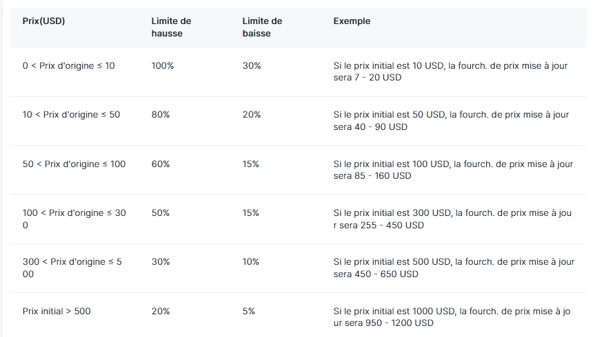 (2) Un dépassement des limites de prix entraînera l'échec de la mise à jour.