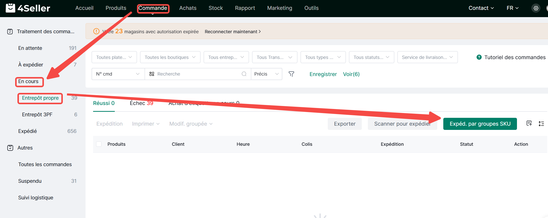 I. Accès : Commandes > En cours > Entrepôt propre > Expédier par groupes SKU