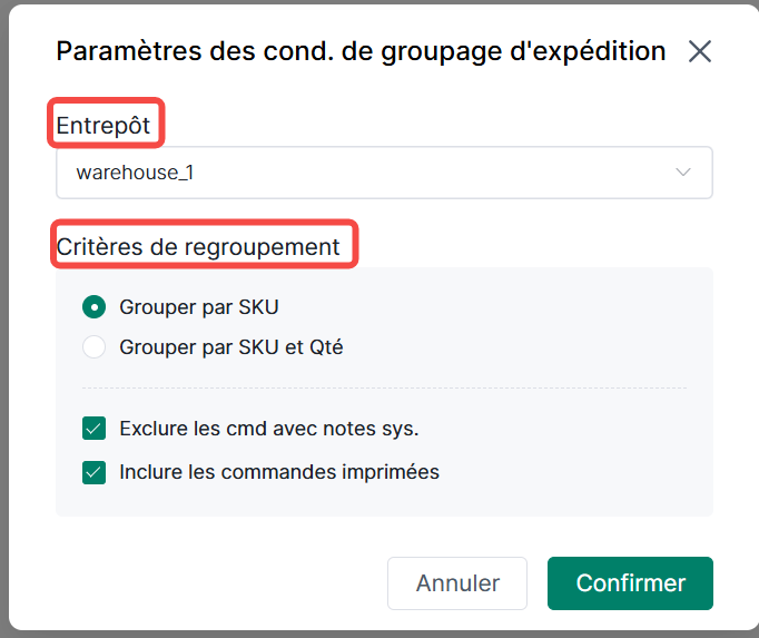(5) Inclure les commandes imprimées : si coché, les commandes déjà imprimées seront groupées (exclues par défaut).