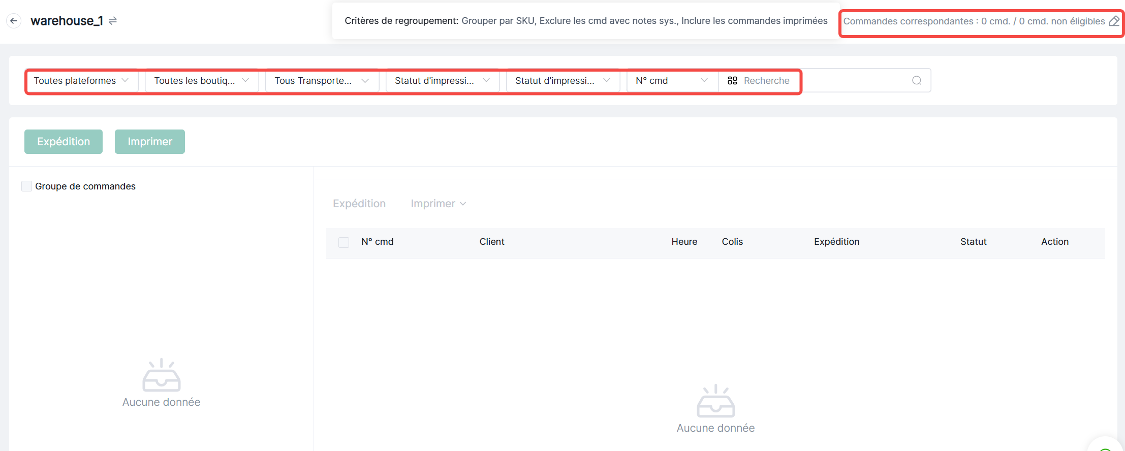 III. Sur la page de regroupement, filtrez les commandes. Survolez le coin supérieur droit pour voir les critères et le nombre de commandes non conformes. Cliquez sur l'icône d'édition pour modifier les filtres.