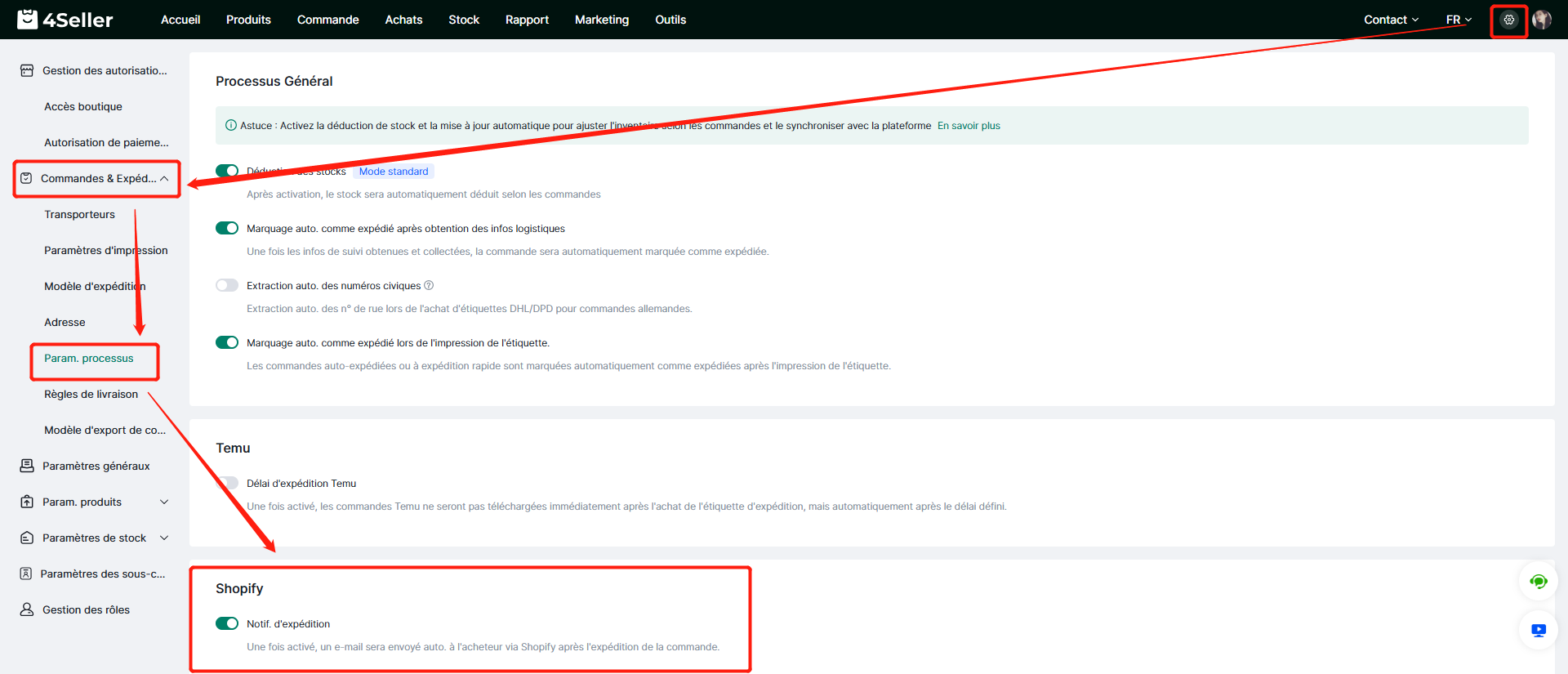 4Seller prend en charge la configuration des notifications d'expédition des commandes Shopify vers les adresses e-mail des acheteurs. Étapes : Paramètres--Param. processus--Shopify--Notif. d'expédition
