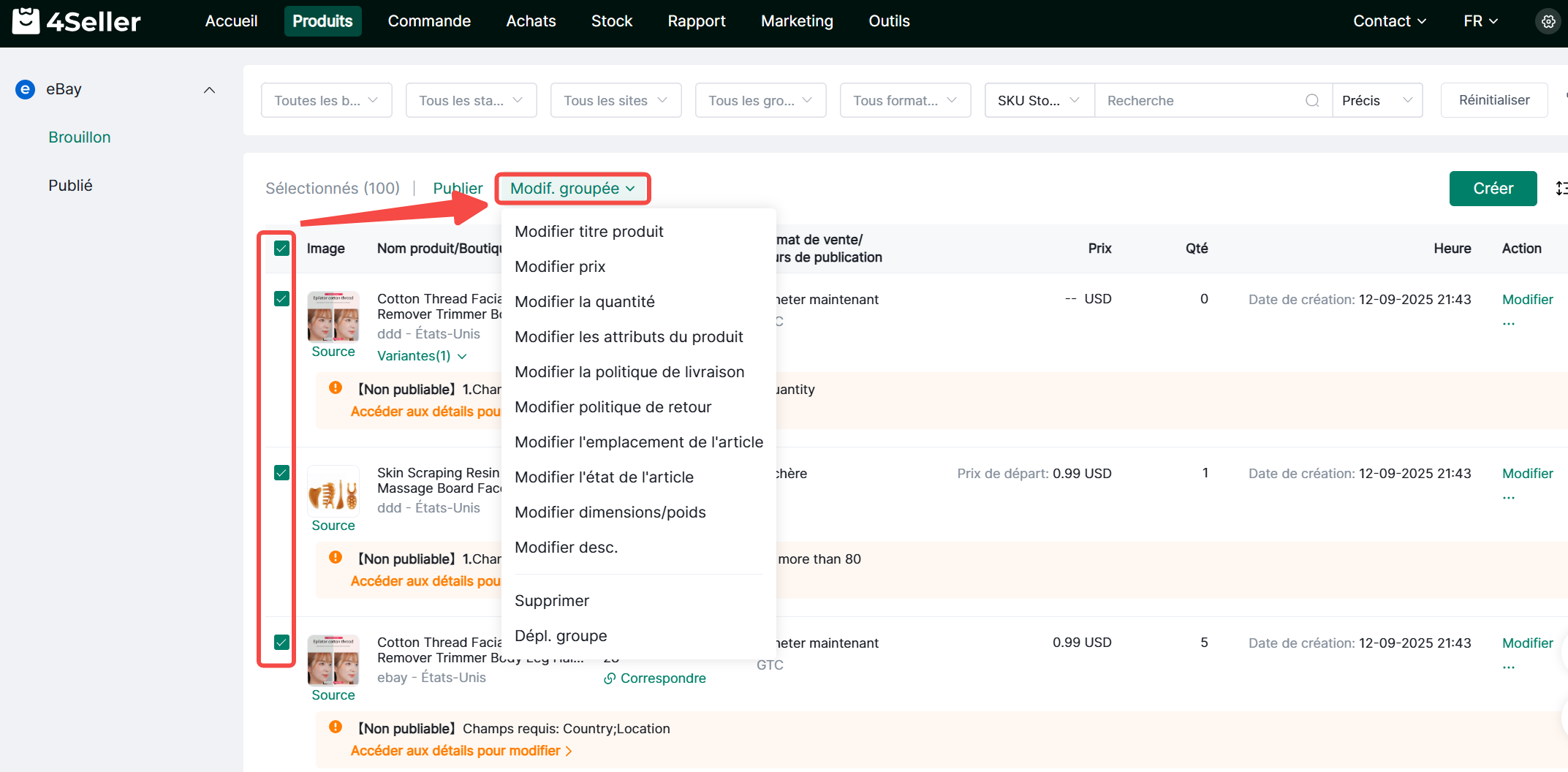 4Seller prend en charge la modification par lots des attributs individuels sur plusieurs produits pour améliorer l'efficacité des listes eBay.