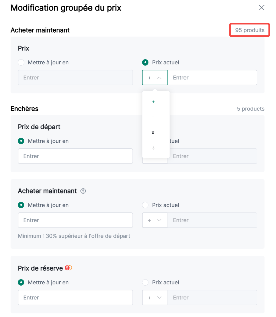 (4) Pour les enchères avec 'Mettre à jour comme' offre de départ et prix d'achat immédiat définis, le prix d'achat immédiat doit être ≥ 1,3 fois l'offre de départ ;