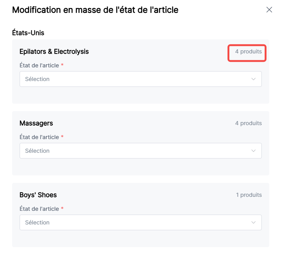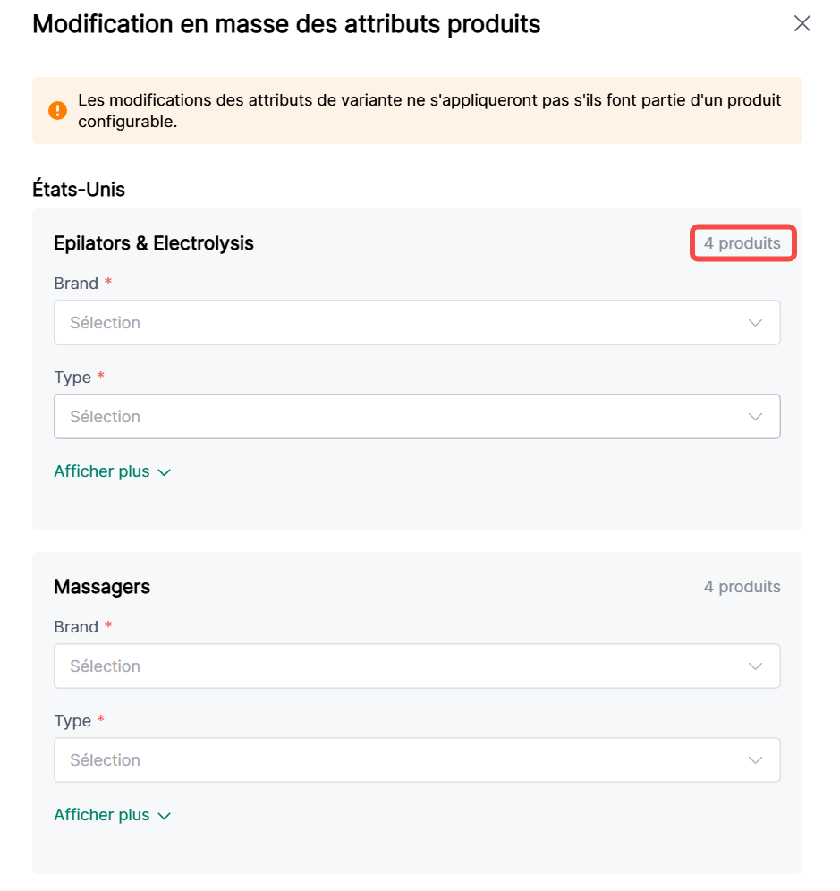 Sur les pages Brouillons ou Publiés, filtrez les produits nécessitant des opérations par lots, sélectionnez-les, puis cliquez sur Actions par lots. Choisissez les attributs à modifier pour les mises à jour en masse.