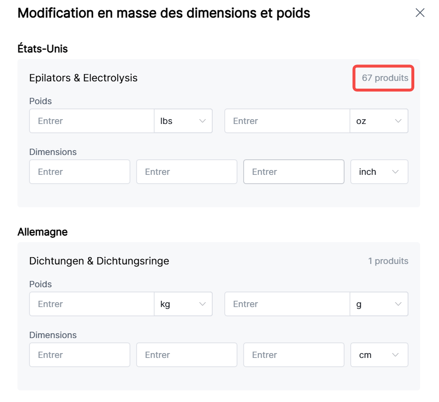 (4) Si vous définissez des dimensions, les trois mesures (longueur, largeur, hauteur) doivent être renseignées