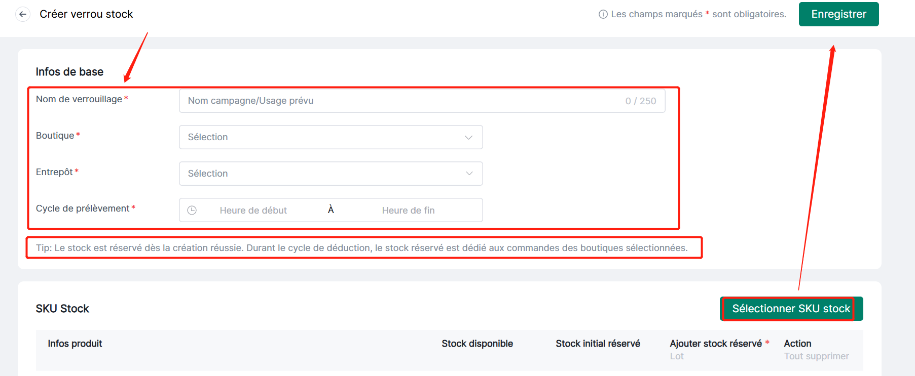 Étape 2 : Remplissez les informations de verrouillage : Nom, Boutique, Entrepôt, Cycle de déduction, sélectionnez le SKU stock, puis cliquez sur Enregistrer.