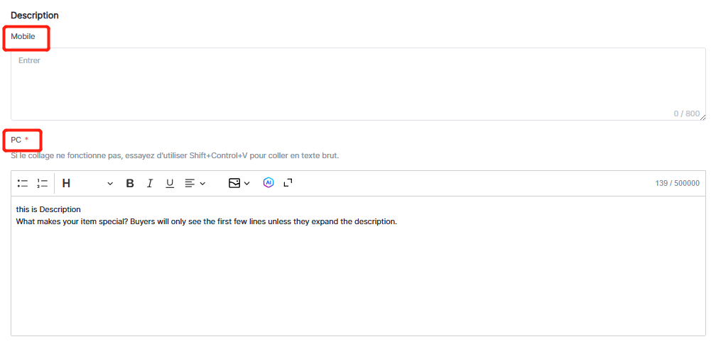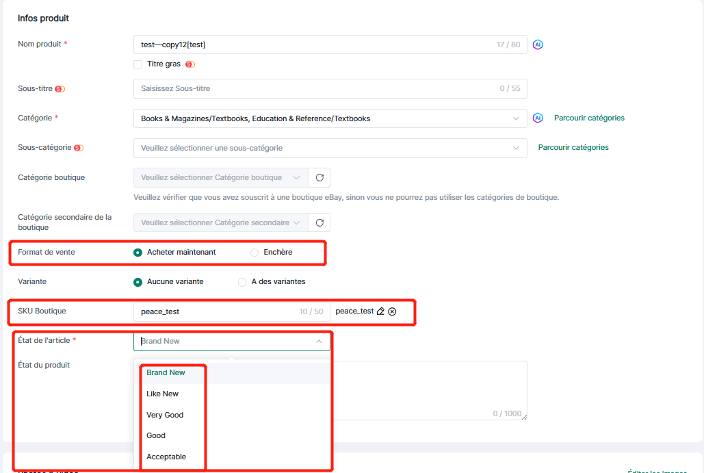 Note : L'achat immédiat prend en charge les variations simple/multiple (selon la catégorie), tandis que les enchères ne prennent en charge que les variations simples.