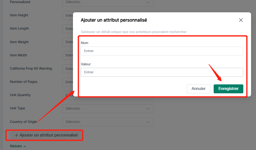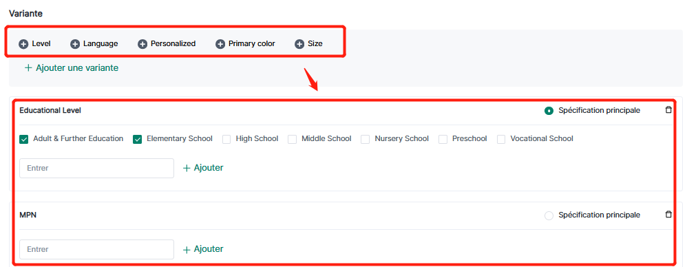 Sélectionner/ajouter des attributs de variante, prise en charge du remplissage par lot des SKU boutique/stock, prix, quantité, ID produits externes (code d'identification selon la catégorie) et autres informations.