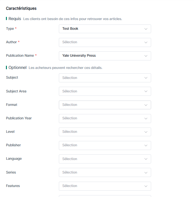 5. Caractéristiques : Marque, Type, Taille, Couleur, Département, etc. synchronisées depuis la plateforme, menu déroulant pour sélectionner l'option.