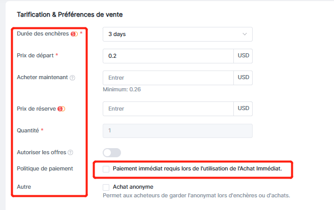 Note: En mode enchères, les fonctions Achat immédiat et Négociation ne peuvent être activées simultanément.