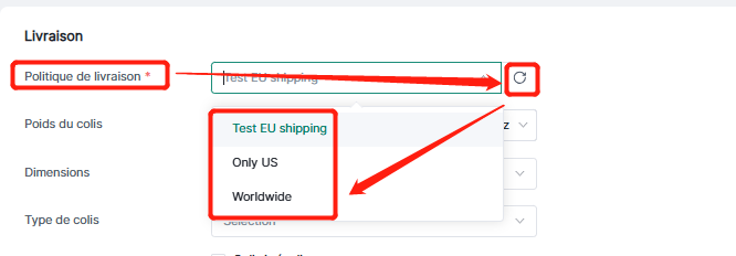 (1) Livraison, Politique de retour : Synchroniser les paramètres backend eBay, cliquer sur le bouton actualiser à droite pour synchroniser, puis sélectionner l'option dans le menu déroulant.