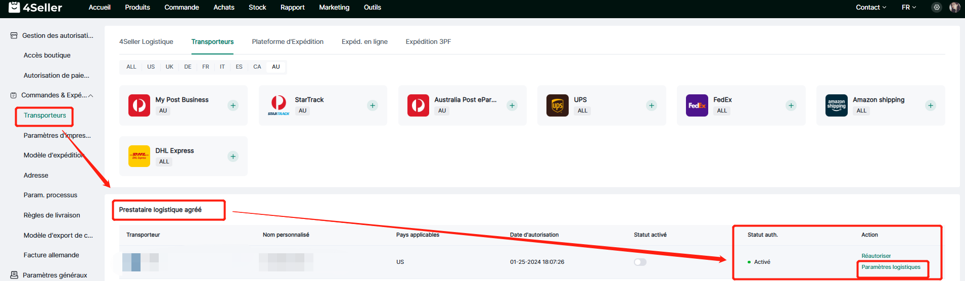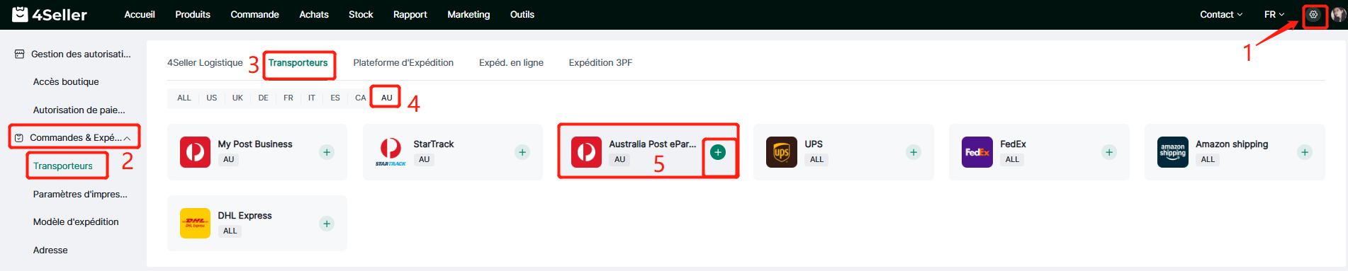 Étape 1 : Paramètres--Commande & Livraison--Transporteurs--Transporteurs--AU