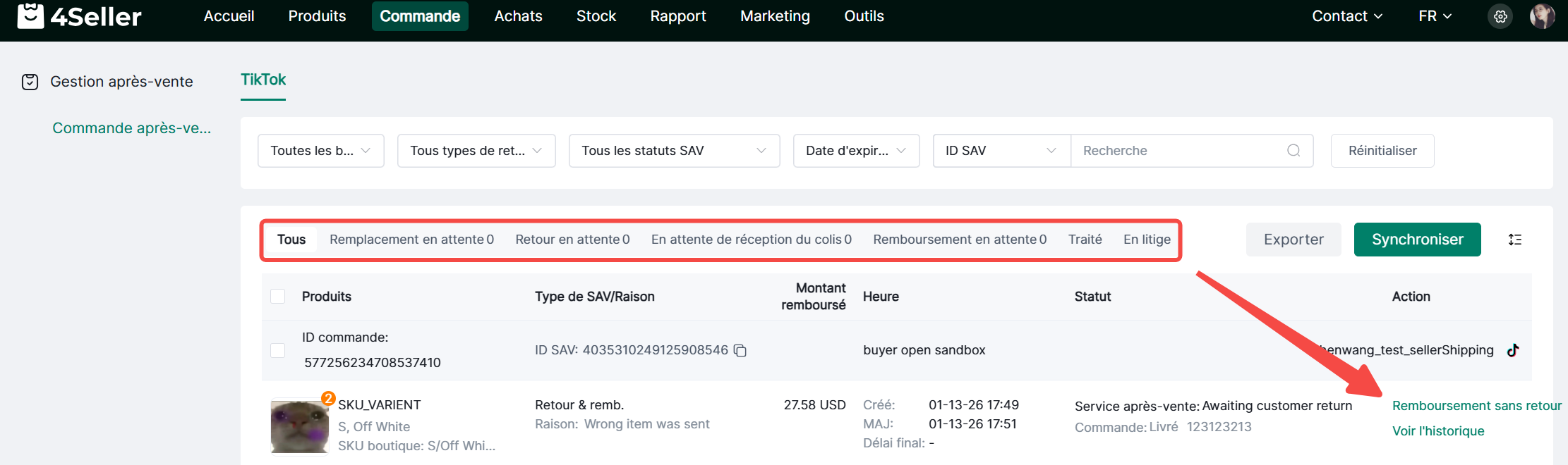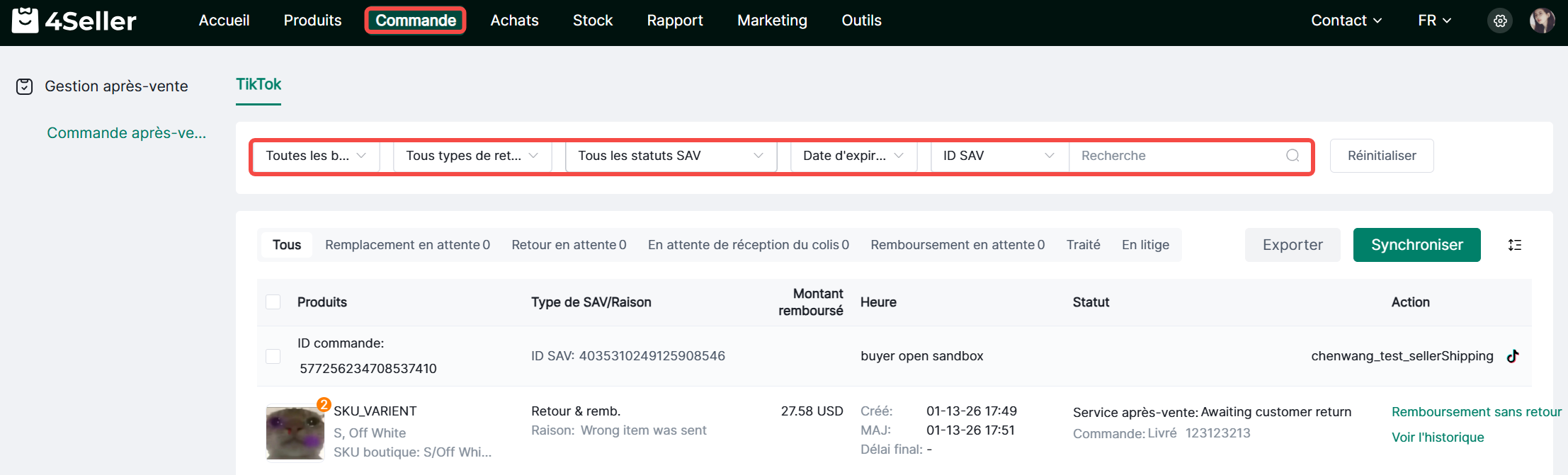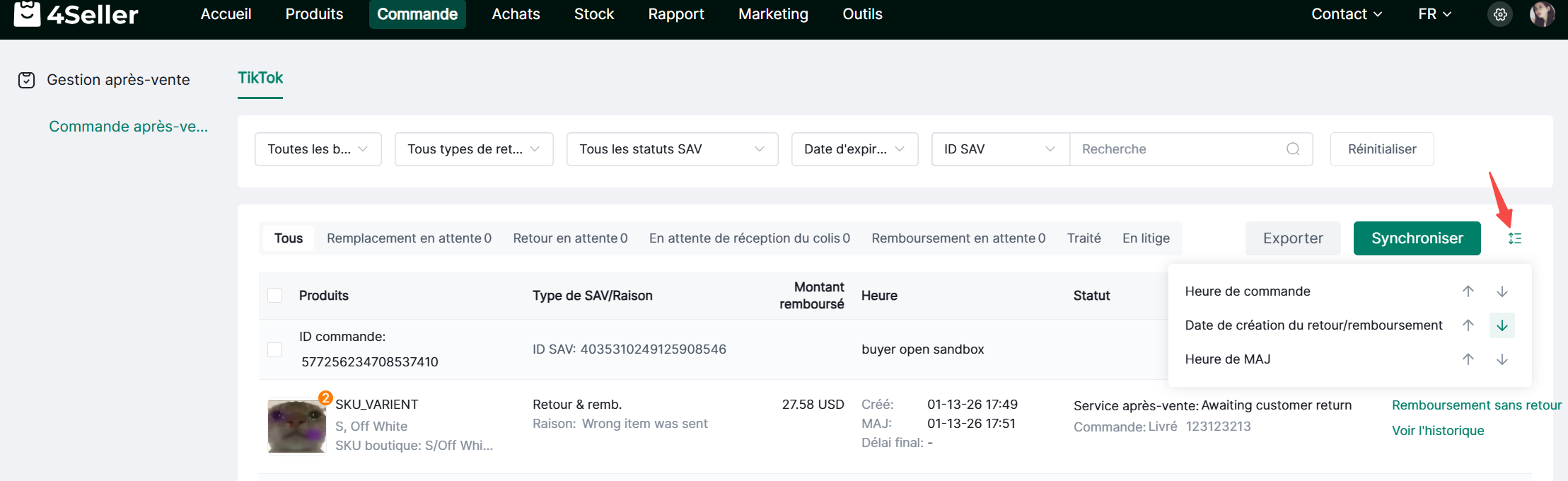 1. Filtrez par boutique, type de retour/remboursement, statut SAV, date d'expiration et ID SAV.