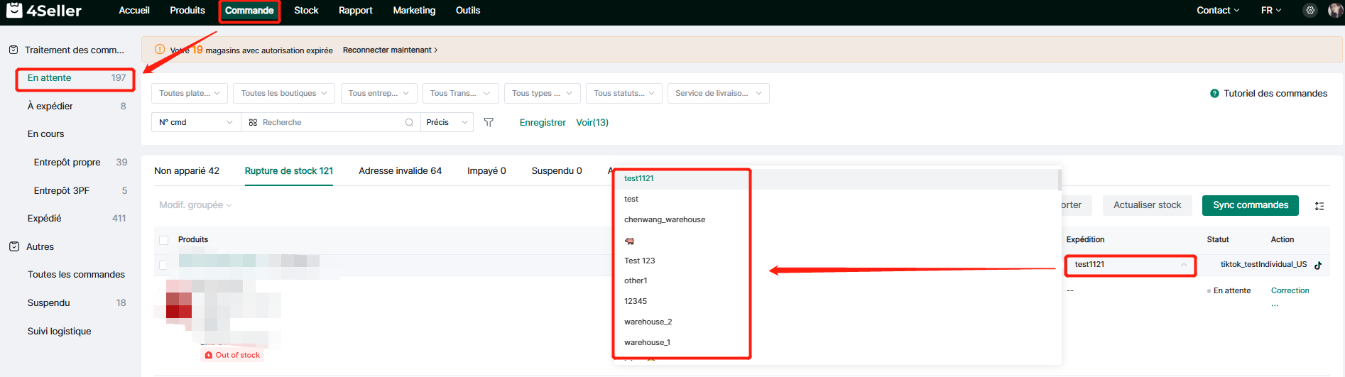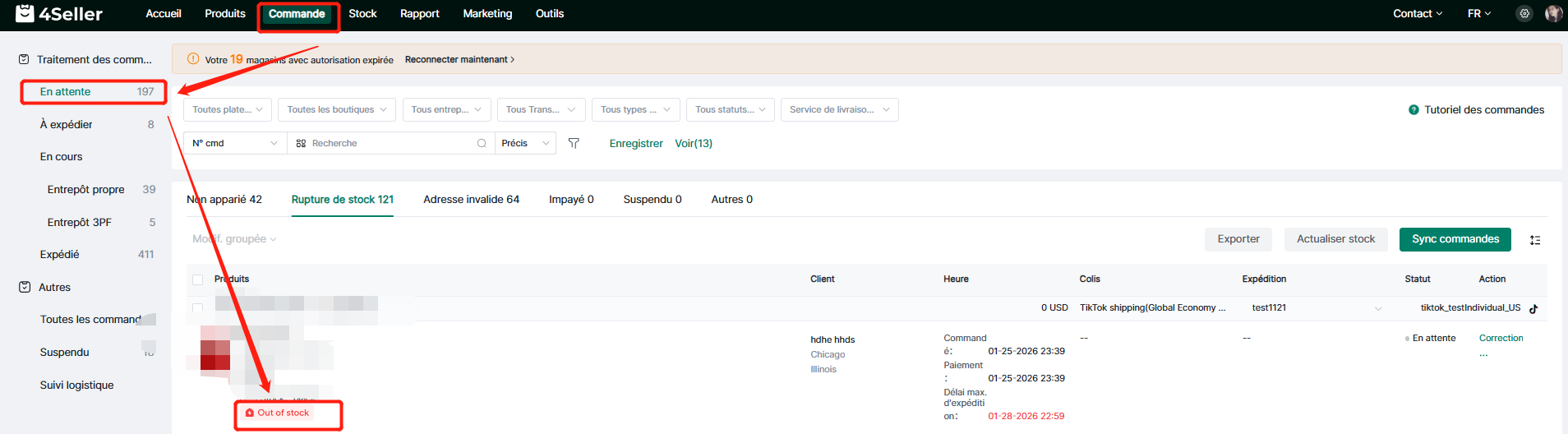 Dans 4Seller, si les commandes sont "En rupture de stock", vous pouvez utiliser les 2 méthodes ci-dessous pour les passer au statut "À expédier".