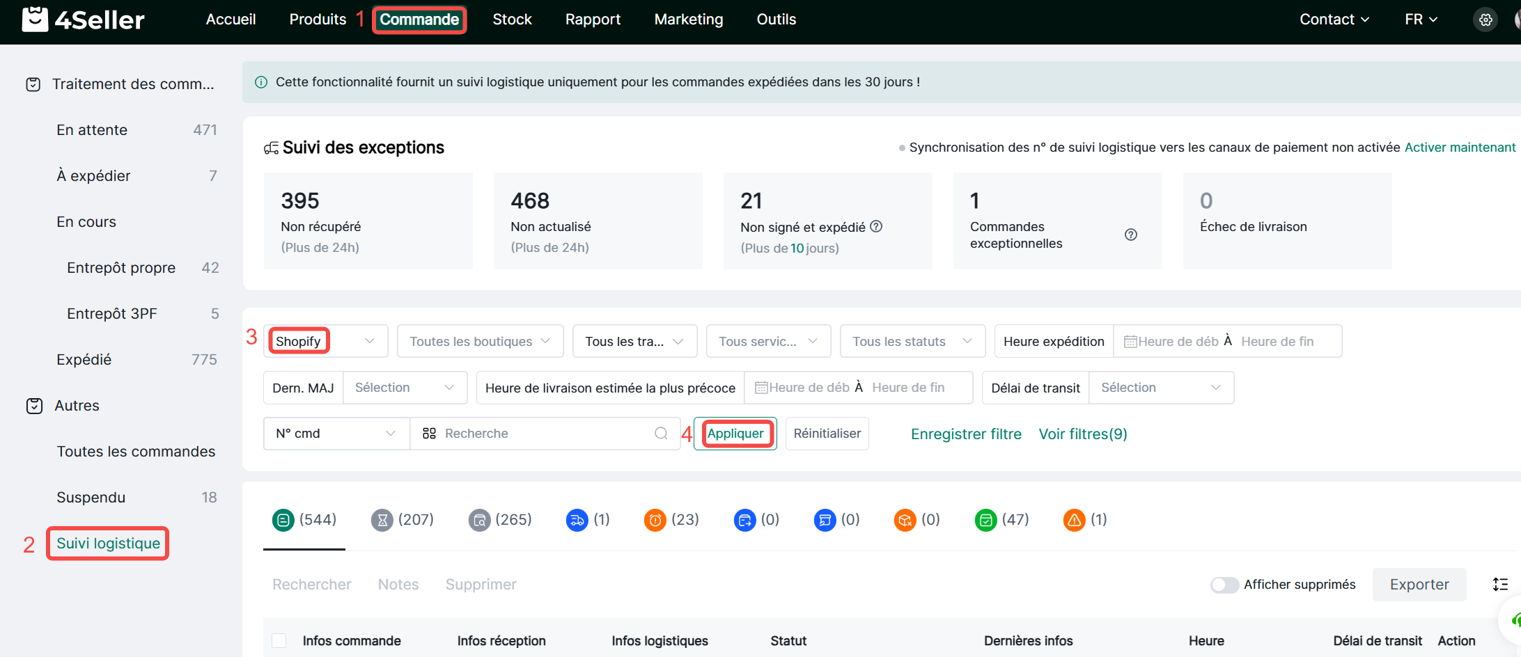 Étape 4 : Commande --Suivi logistique--Filtrer Shopify--Vérifier le statut d'association