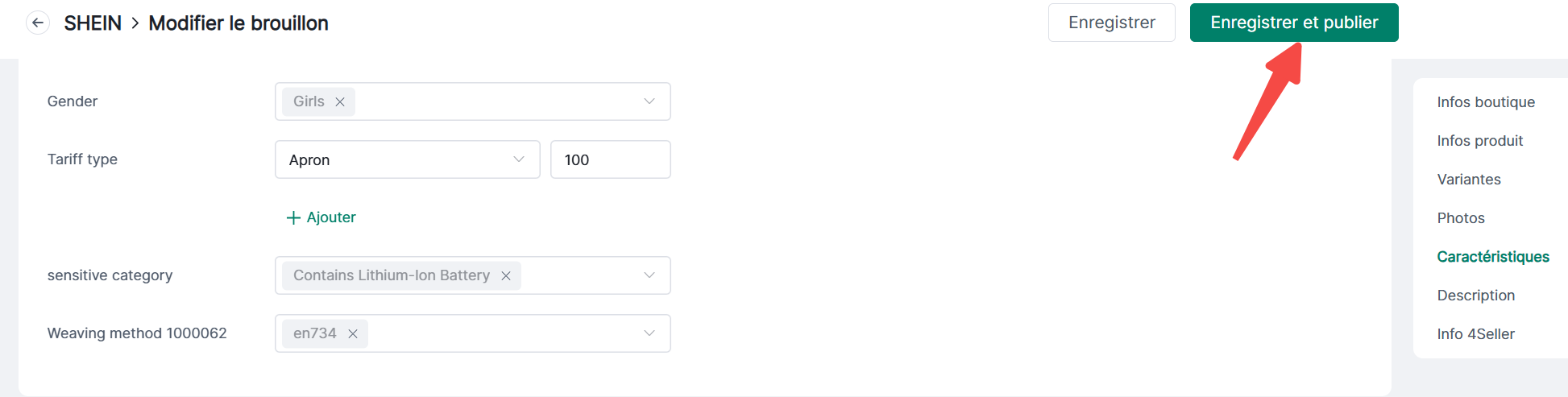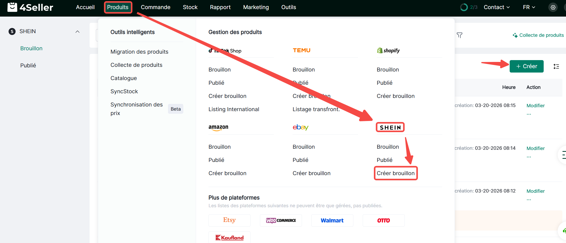 1. Cliquez sur Produits > SHEIN > Brouillons > Créer un brouillon, ou cliquez sur Créer après être entré dans la page produit.