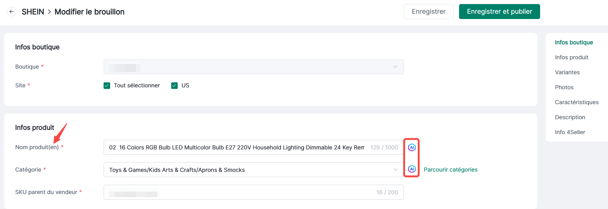 [Les titres et catégories de produits peuvent également être générés avec l'assistance IA]