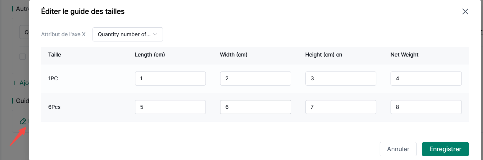 ③ Guide des tailles : Cliquez sur le bouton "Modifier" pour saisir les informations de taille.