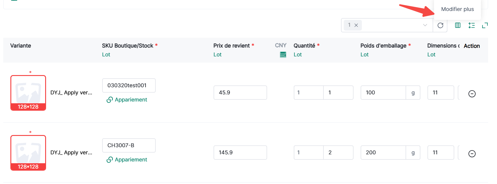 ④ Variantes : Générez des variantes basées sur les attributs de variante sélectionnés. Cliquez sur "Actualiser l'entrepôt" pour remplir les informations pertinentes ; vous pouvez également cliquer sur "Édition plein écran" ou utiliser le traitement par lot. Cliquez sur "Correspondre SKU stock"