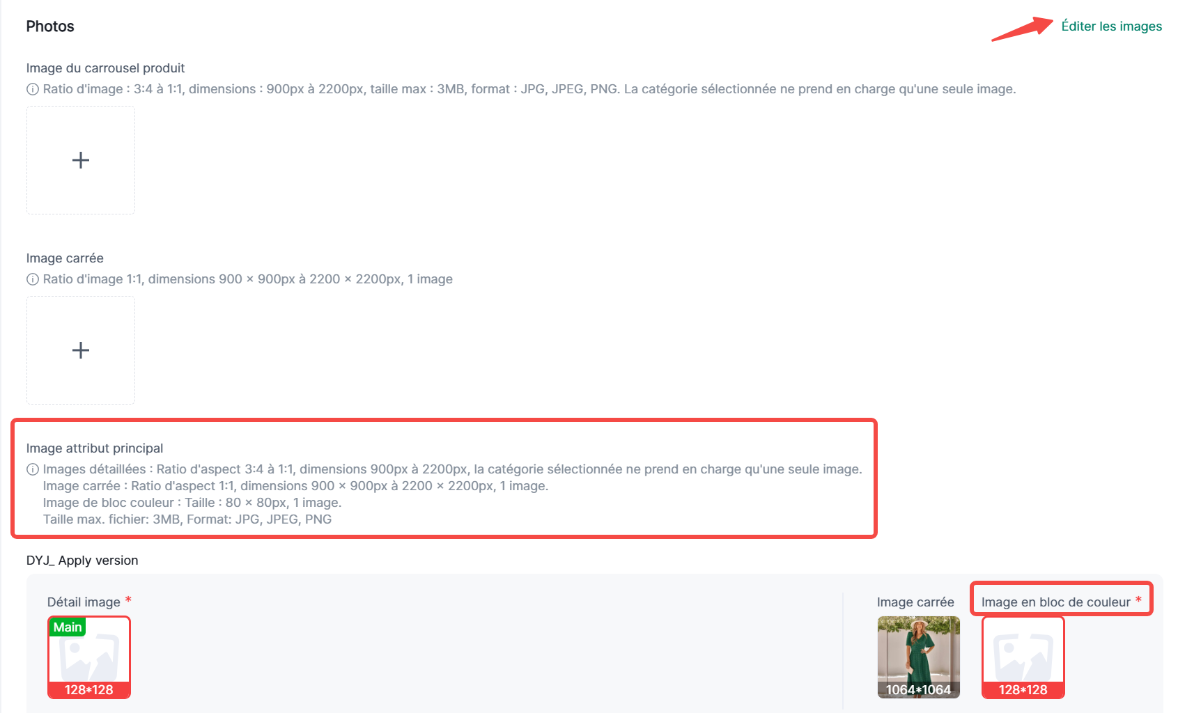 ⑤ Images : Les éléments marqués en rouge sont des images obligatoires. Si le nombre d'attributs pour la spécification principale est ≥2, une image d'échantillon de couleur doit être fournie. Différentes images doivent être renseignées selon les exigences pertinentes. Cliquez sur "Modifier les images" pour ajuster les dimensions des images par lot.