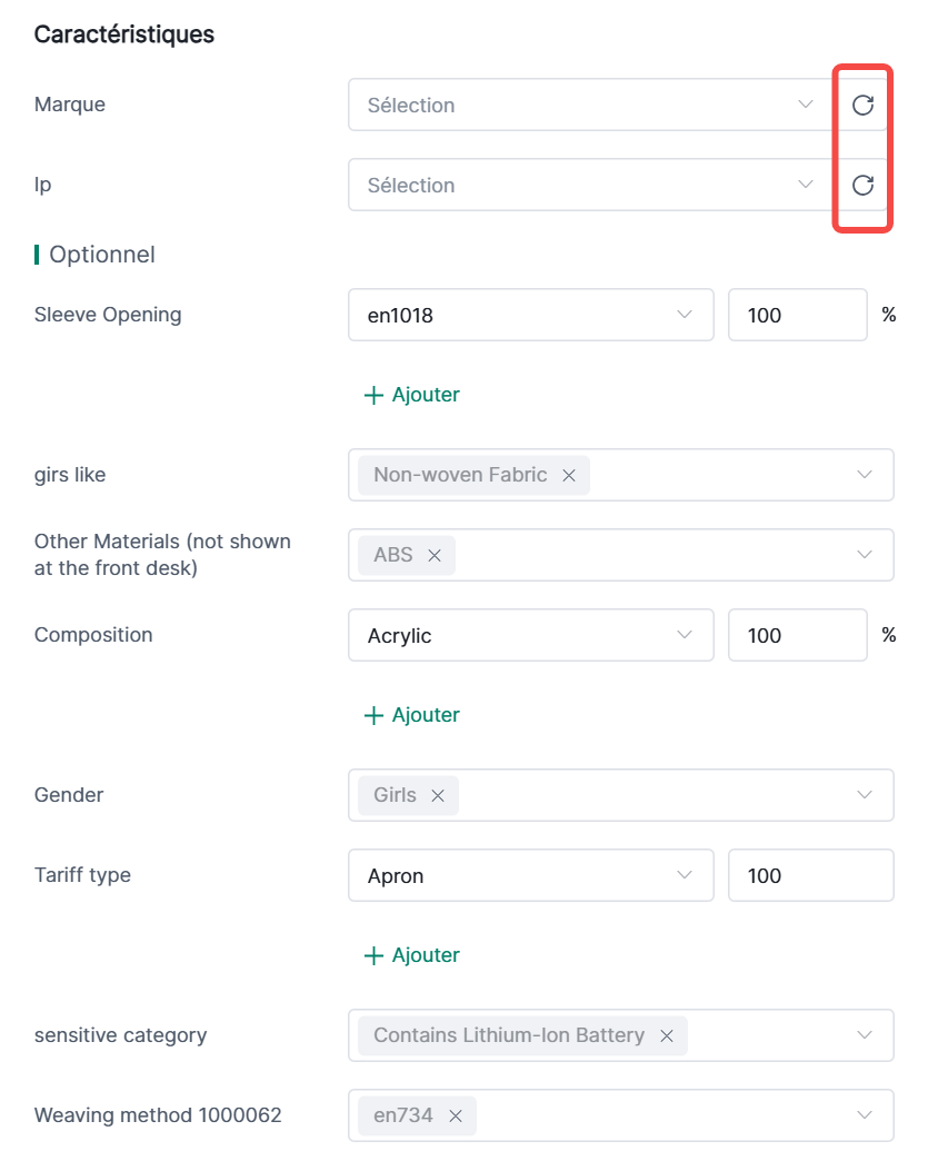 (4) Attributs produit : Sélectionnables après actualisation et synchronisation