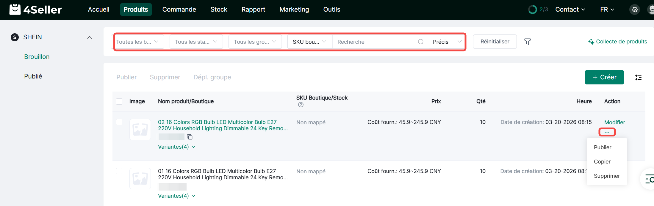 (1) Si la publication échoue, effectuez des modifications basées sur le message d'erreur et republiez, ou effectuez des opérations telles que copier ou supprimer. Des options de recherche et de filtrage sont disponibles en haut.