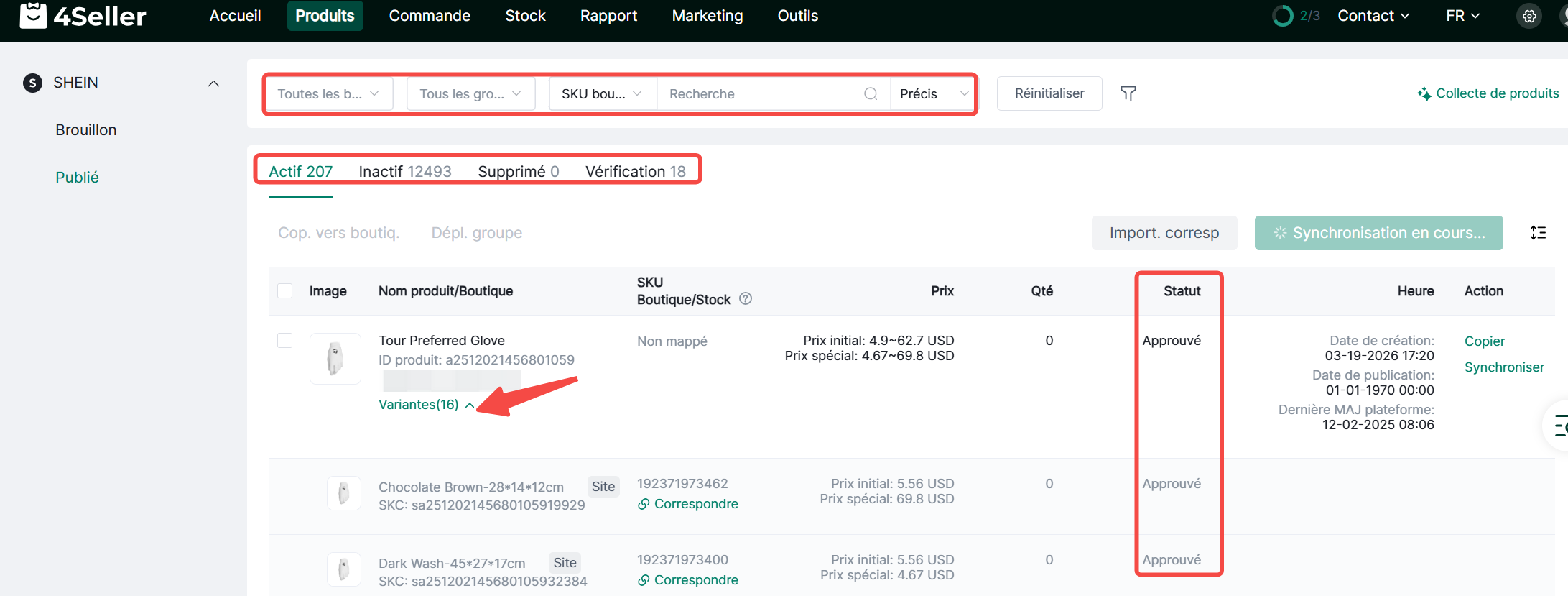(2) Après une publication réussie, le produit apparaîtra dans la liste Publiés. Cliquez sur "Variantes" pour développer et voir le statut de publication de chaque variante. Cliquez sur 'Copier' pour copier les informations produit vers la section Brouillons, ou cliquez sur "Synchroniser" pour mettre à jour les informations de la plateforme sur la page de liste.