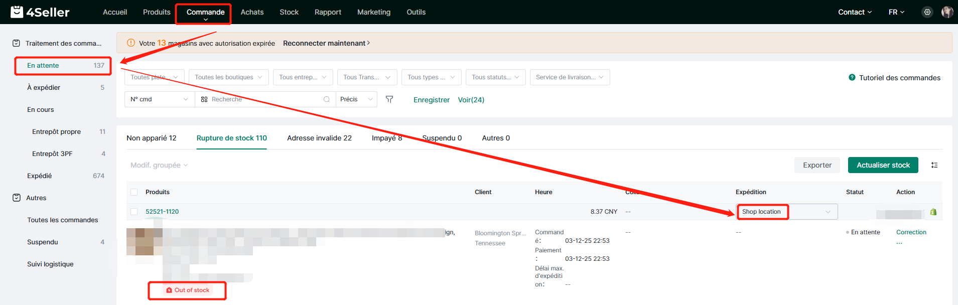 (2) Lorsque la commande apparaît en rupture de stock, veuillez vérifier si l'entrepôt a été sélectionné correctement. Si le stock est insuffisant, réapprovisionnez-le, puis cliquez sur le bouton Actualiser le stock pour faire correspondre le stock.
