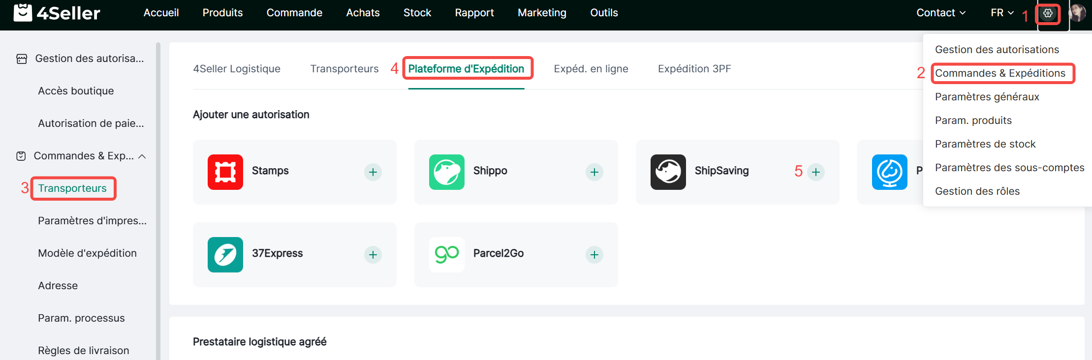 ① Appuyez sur l'icône Paramètres > Cliquez sur Commandes & Expeditions>Transporteurs > Plateforme d'Expédition > Cliquez sur « Ajouter un compte »