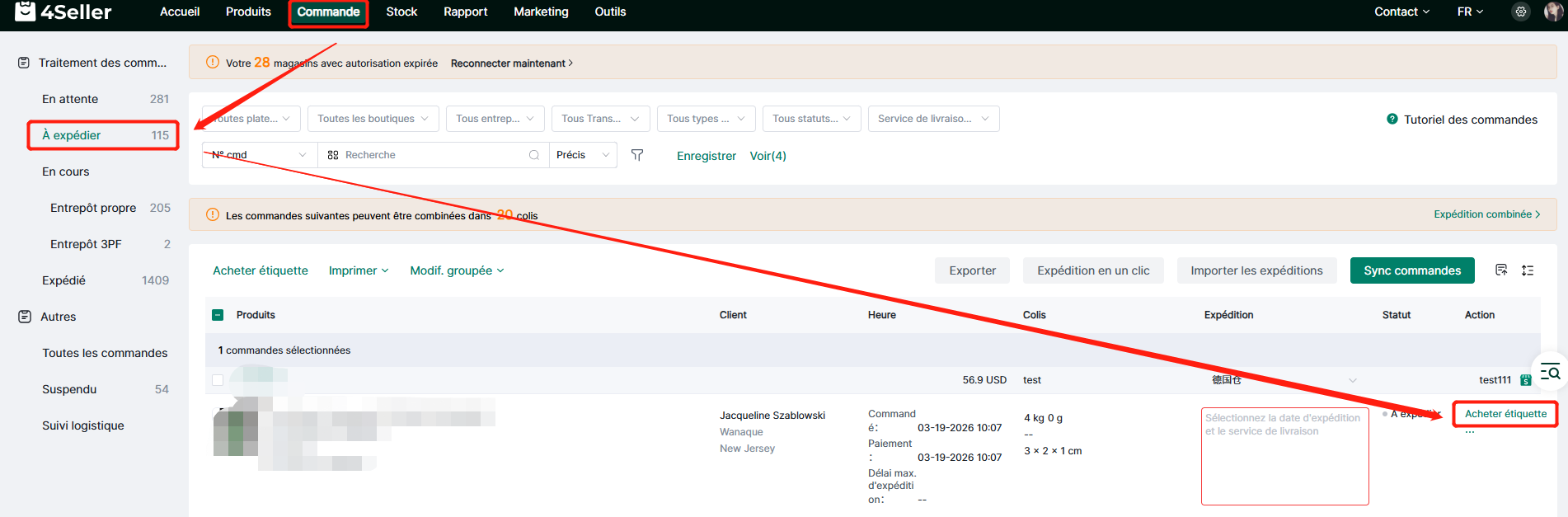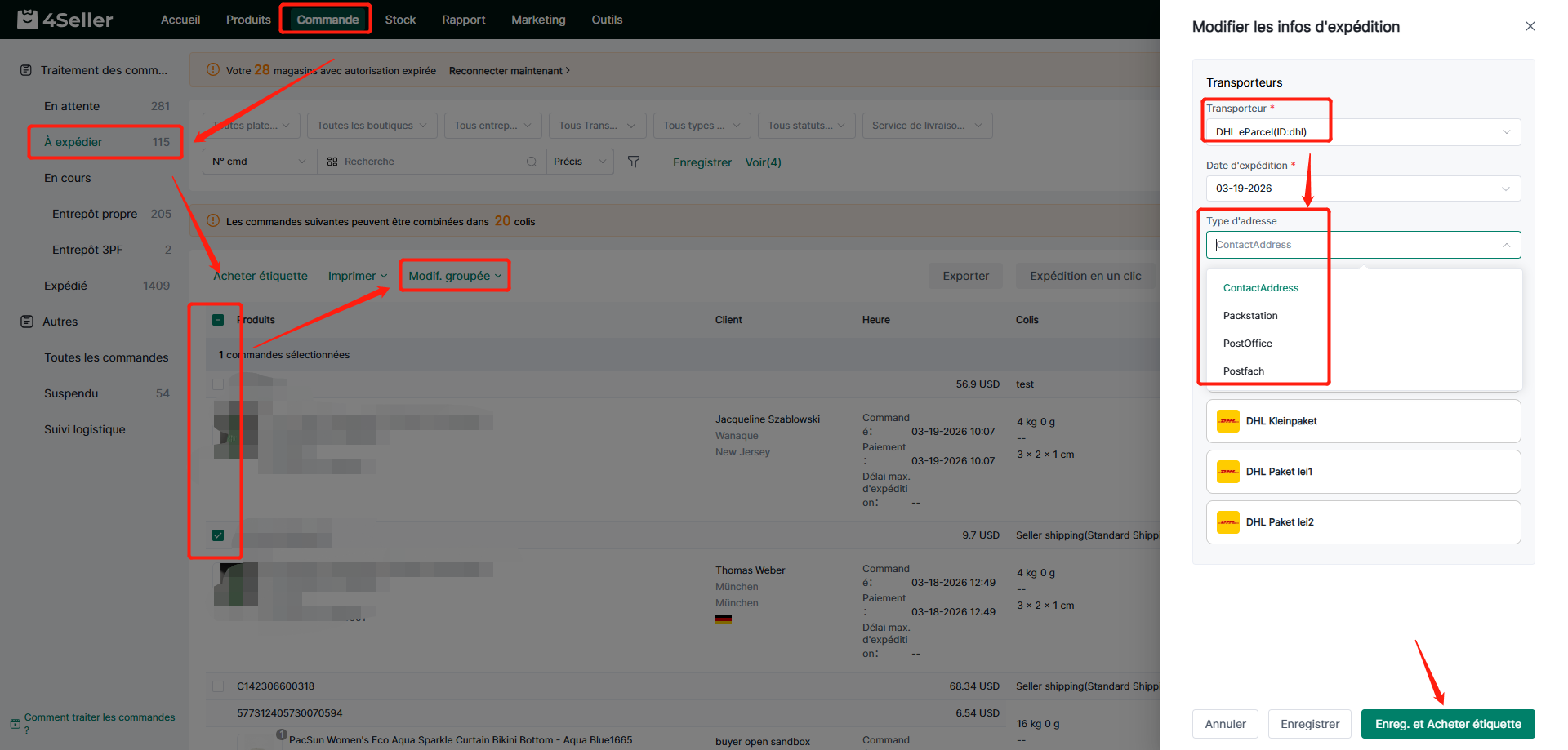 Achat d'étiquettes en gros : Commande – Sélectionnez certaines commandes et toutes les commandes – Cliquez sur « Modification par lots » – Informations d'expédition – Sélectionnez les informations d'expédition – Assistance – Sélectionnez le type d'adresse – Sélectionnez les services d'expédition – Cliquez sur « Enregistrer et acheter l'étiquette »