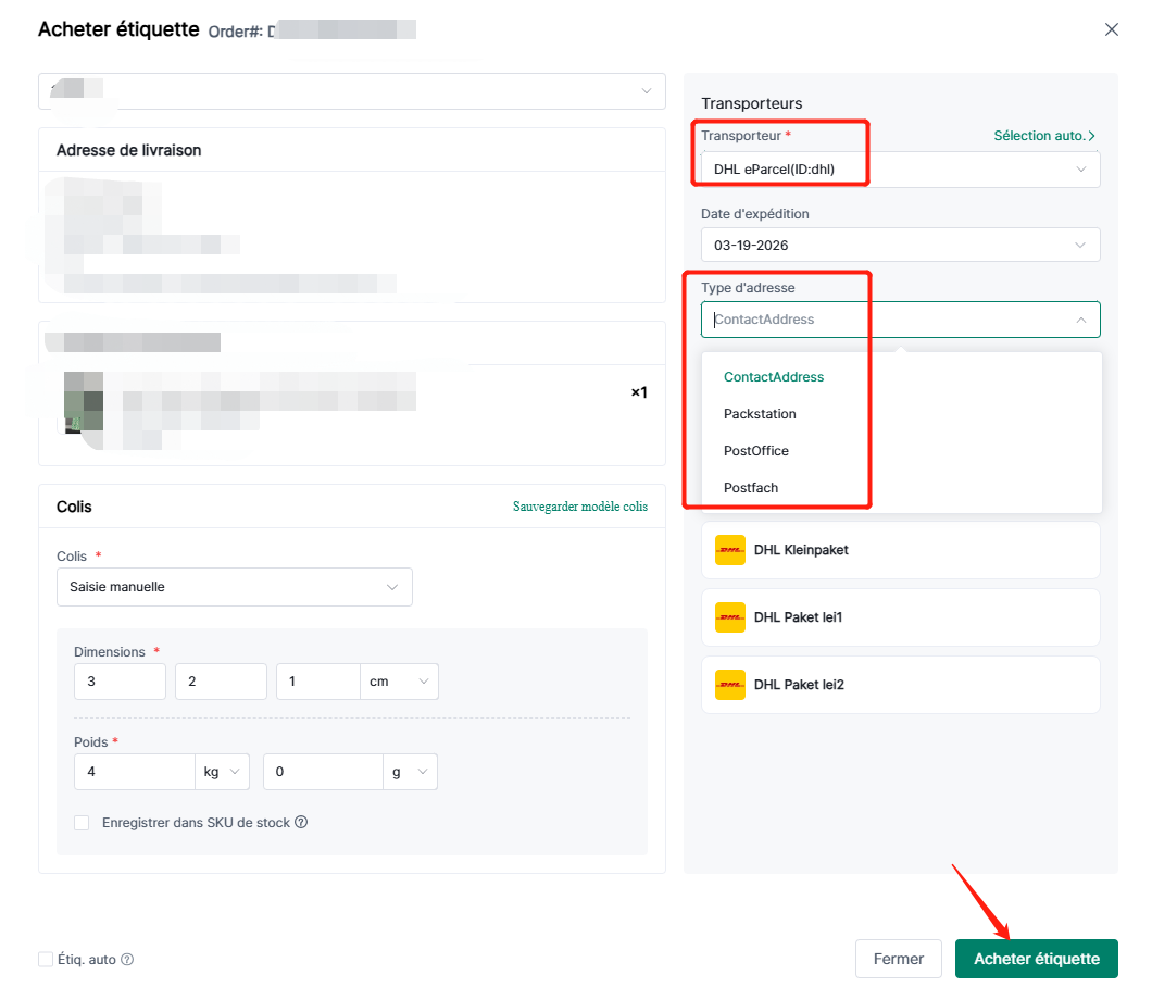 Étape 3 : Acheter une étiquette avec une seule commande : Cliquez sur « Acheter une étiquette » - Sélectionnez le transporteur « DHL eParcel » - Sélectionnez le type d’adresse - Sélectionnez le service d’expédition - Cliquez sur « Acheter une étiquette »
