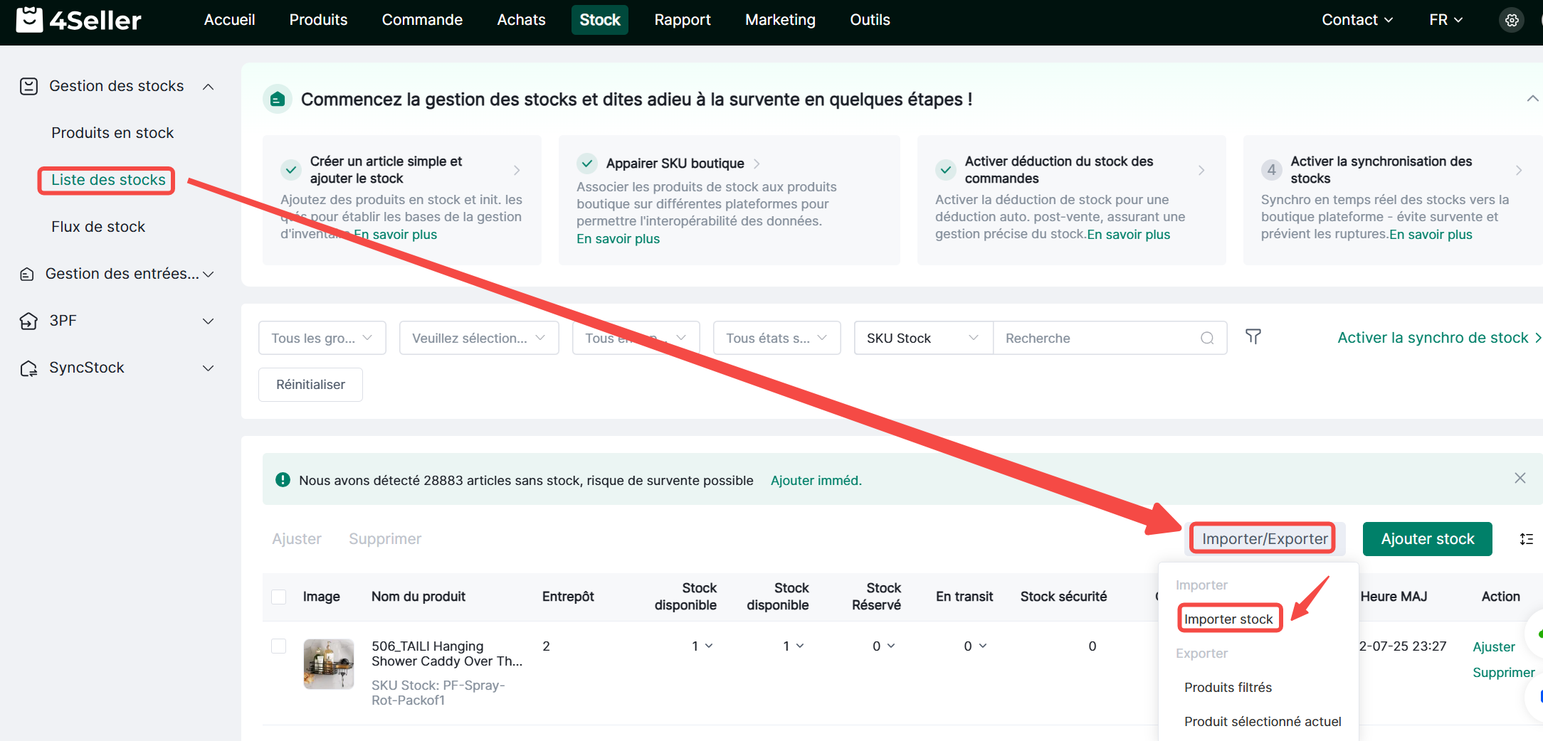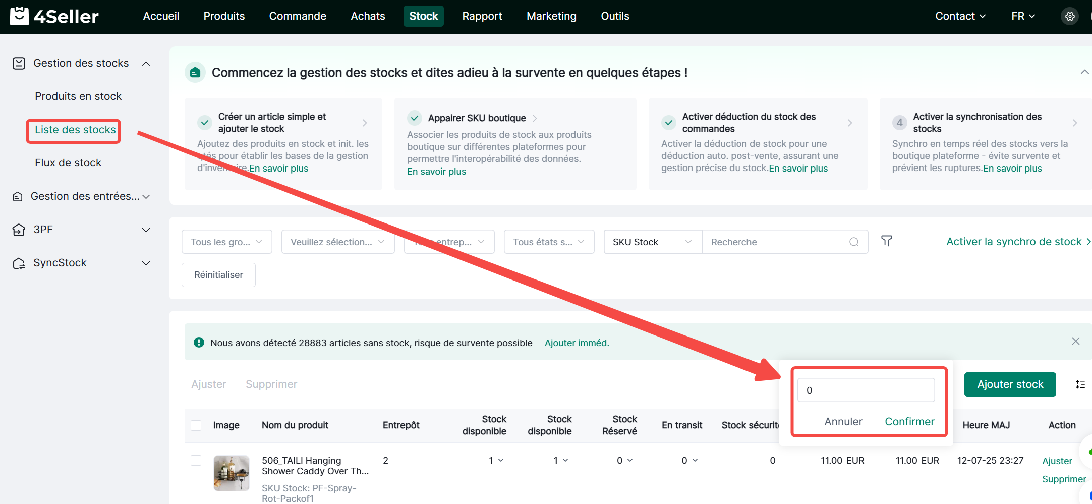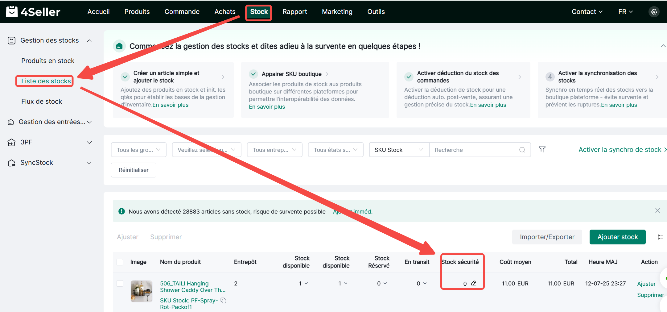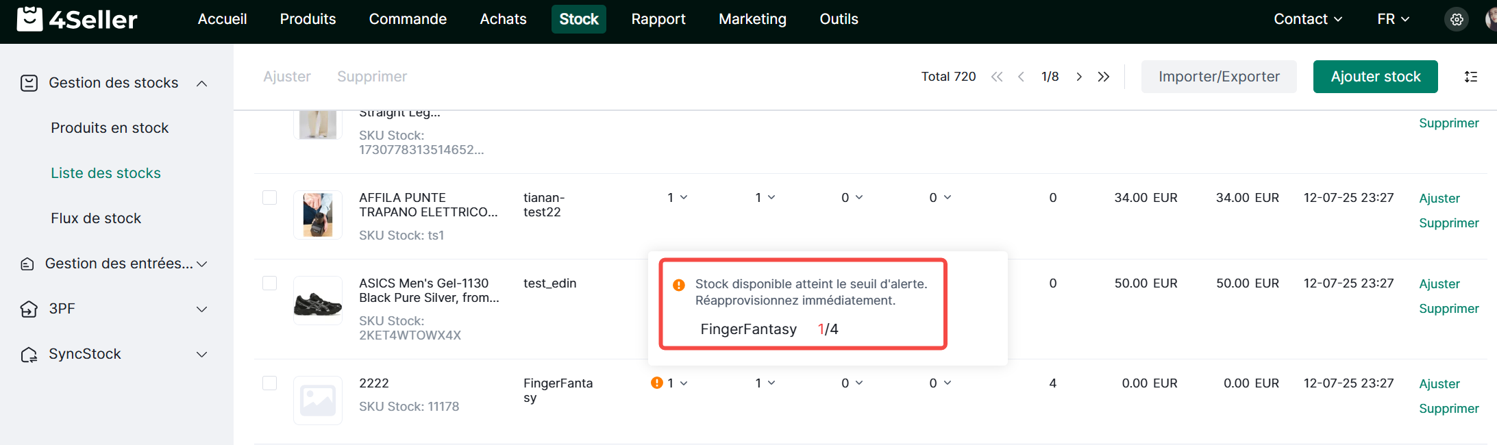 4Seller permet de définir des seuils d'alerte de stock pour les quantités en stock des SKU. Lorsque la quantité en stock d'un SKU atteint le seuil d'alerte, une alerte de stock sera déclenchée.