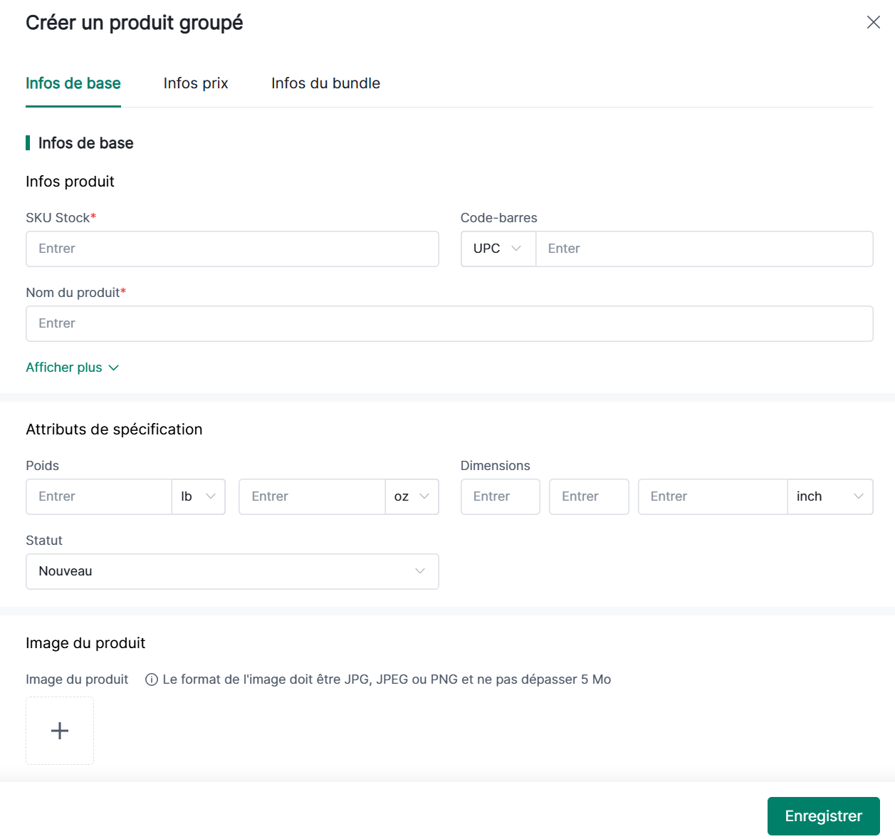 (1) Sur la page de création d'un Produit Bundle, vous pouvez remplir les Infos de Base, les Infos de Prix, les Infos Bundle