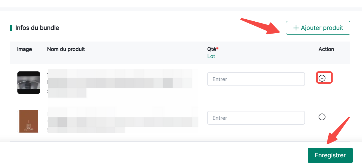 (3) Dans les Infos Bundle, vous pouvez sélectionner les produits inclus dans le bundle et configurer la quantité.