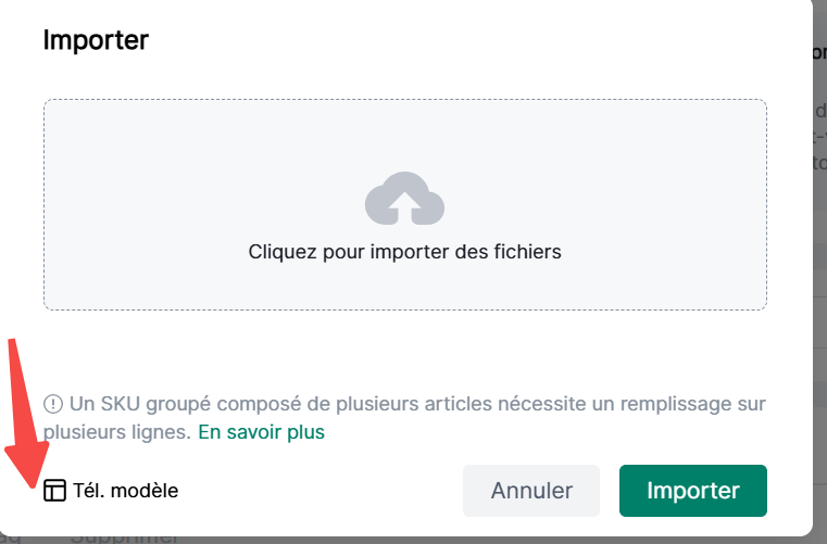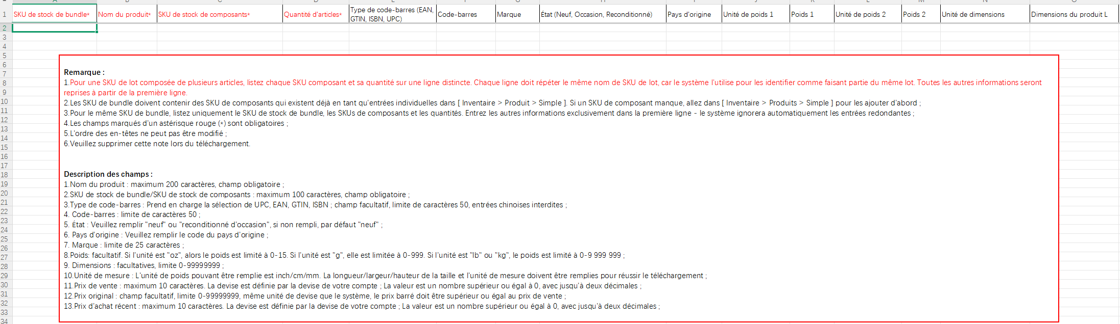 (2) Le Stock Sku, le Nom du Produit, et les Infos Bundle avec la quantité sont des champs obligatoires à remplir.
